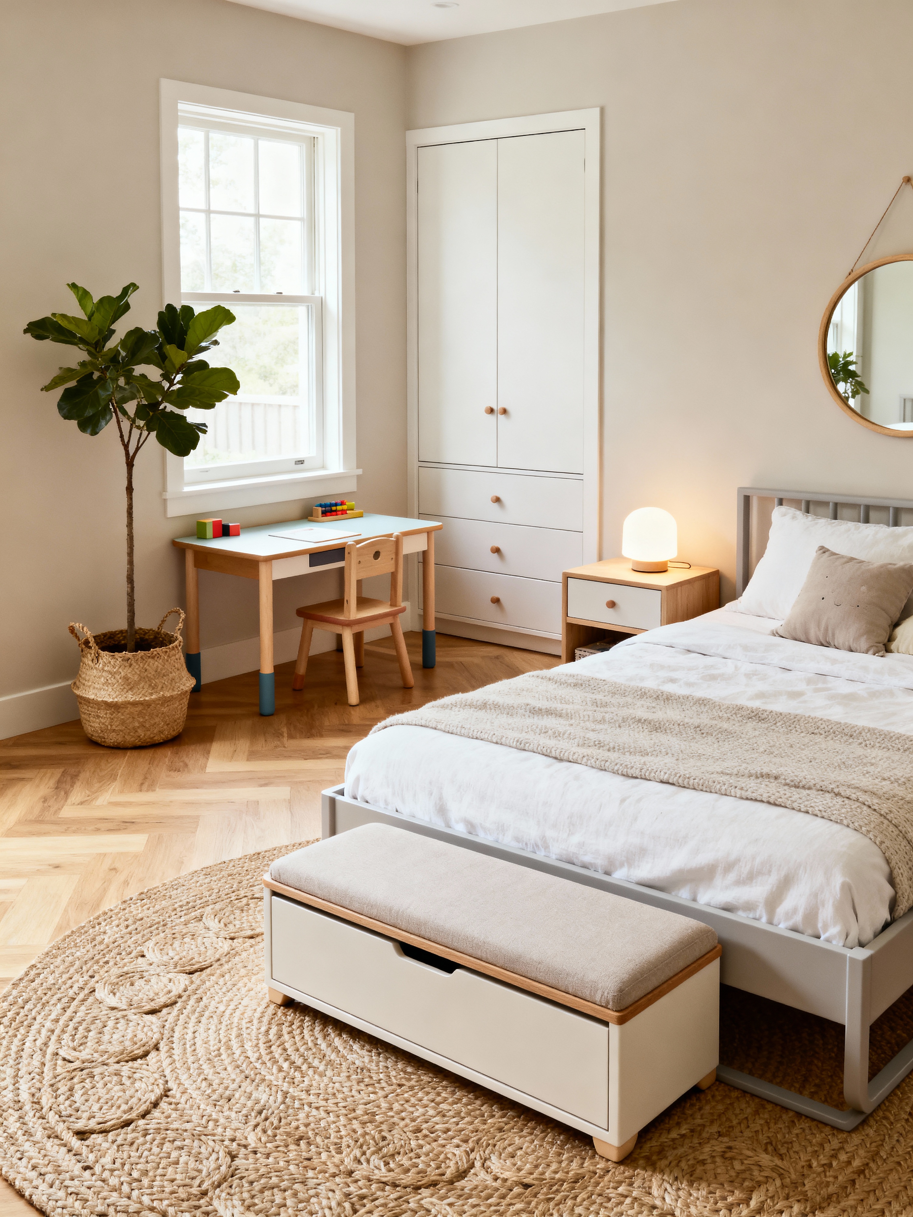 kids room with modern style with night light and storage bench or ottoman and bedside table or night stand and kids desk and plant and dresser closet and bed and mirror. . with open and natural lighting and simple, clean lines and simplistic furniture and practicality and functionality and neutral walls and textures and natural materials and elements and open and natural lighting