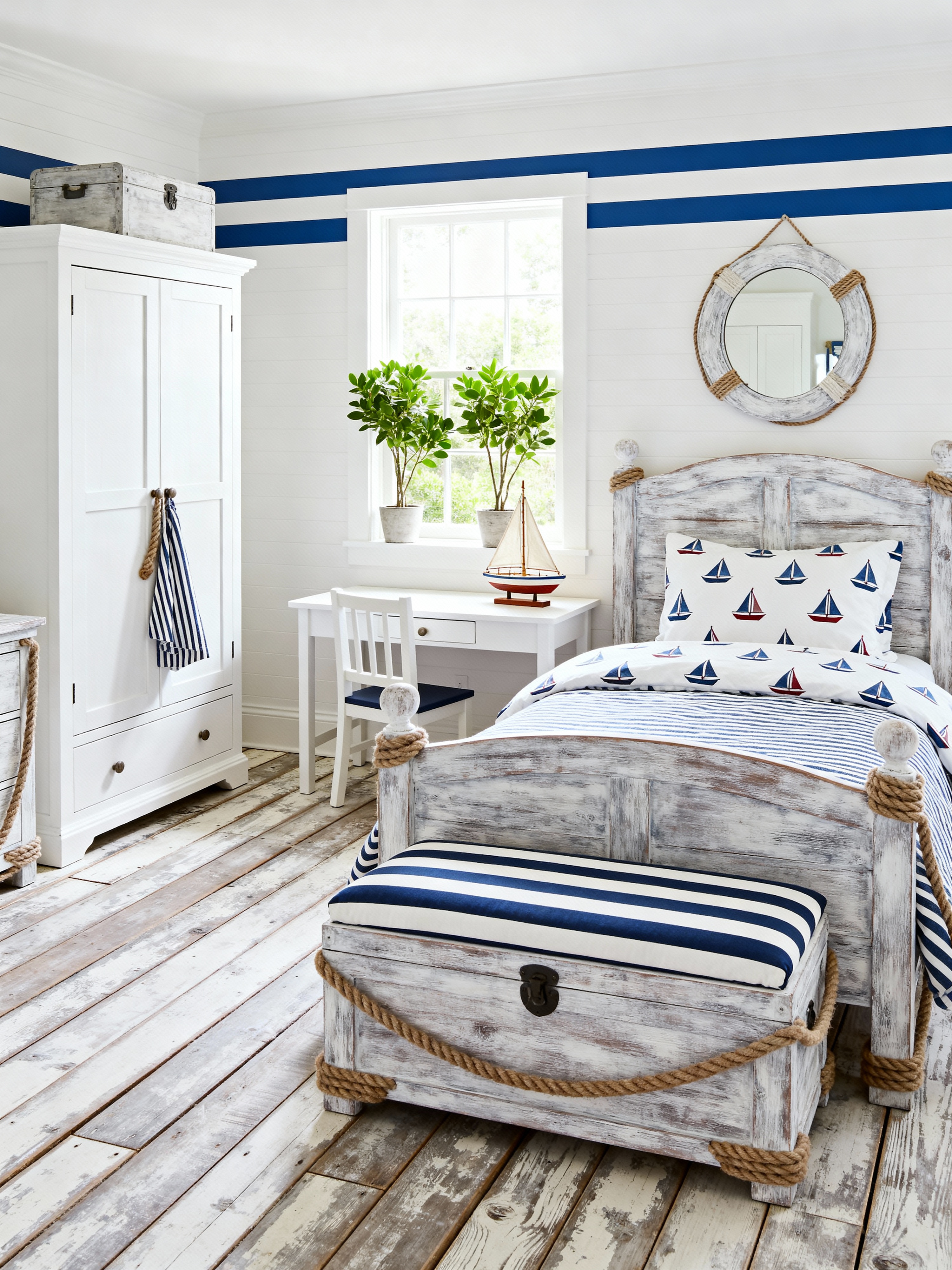 kids room with nautical style with plant and kids desk and storage bench or ottoman and bed and headboard and dresser closet and mirror and bedside table or night stand. . with striped patterns and rope details and coastal vibes and weathered wood and seaside charm and crisp white and ocean inspiration and sailboat elements