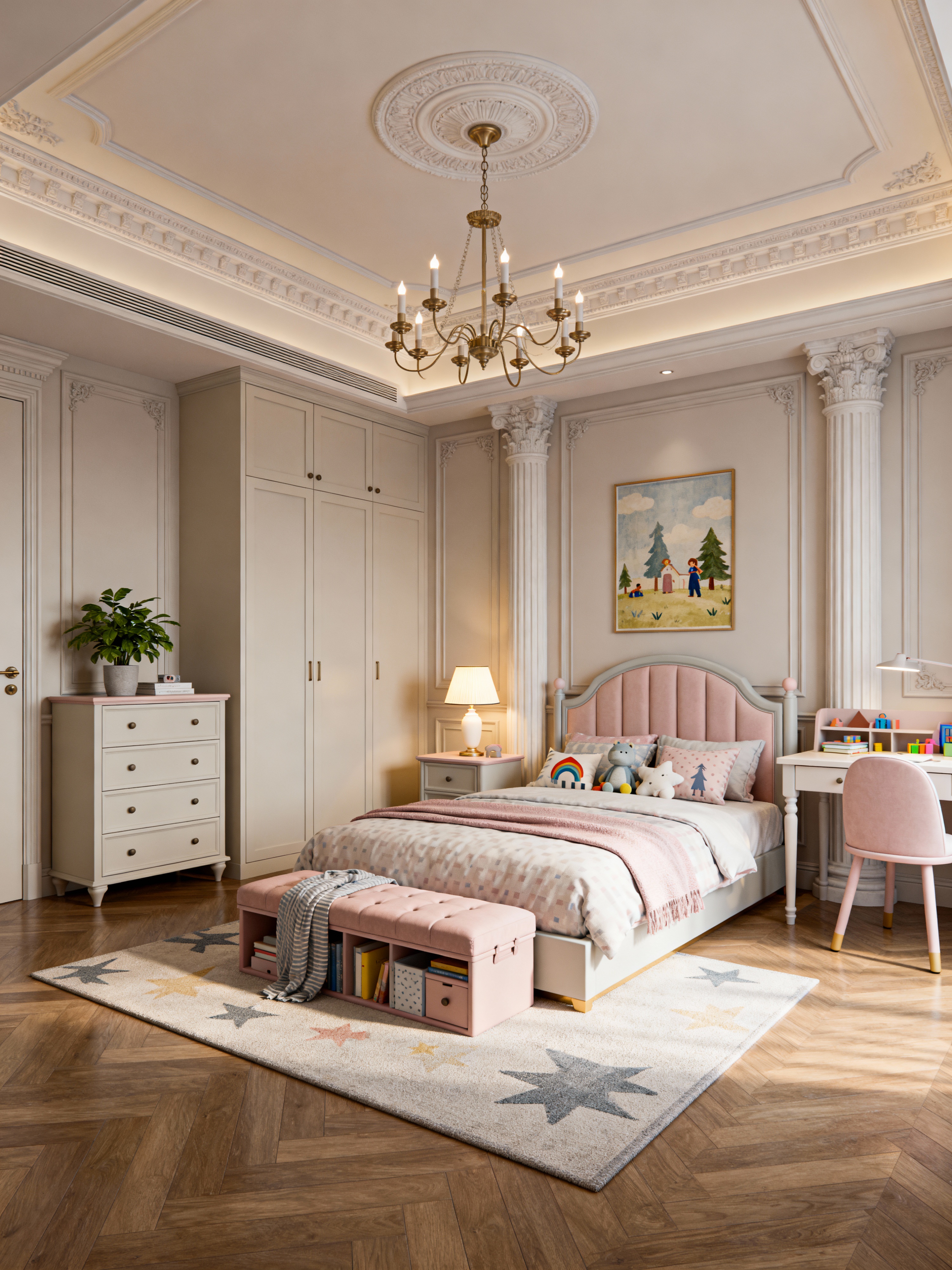 kids room with neoclassic style with night light and bedside table or night stand and storage bench or ottoman and dresser closet and plant and kids desk and headboard and accent chair. . with emphasized horizontal and vertical lines and classical architectural details and timeless artwork and symmetric layouts and geometric decorative elements and timeless furniture and greek columns and high ceilings