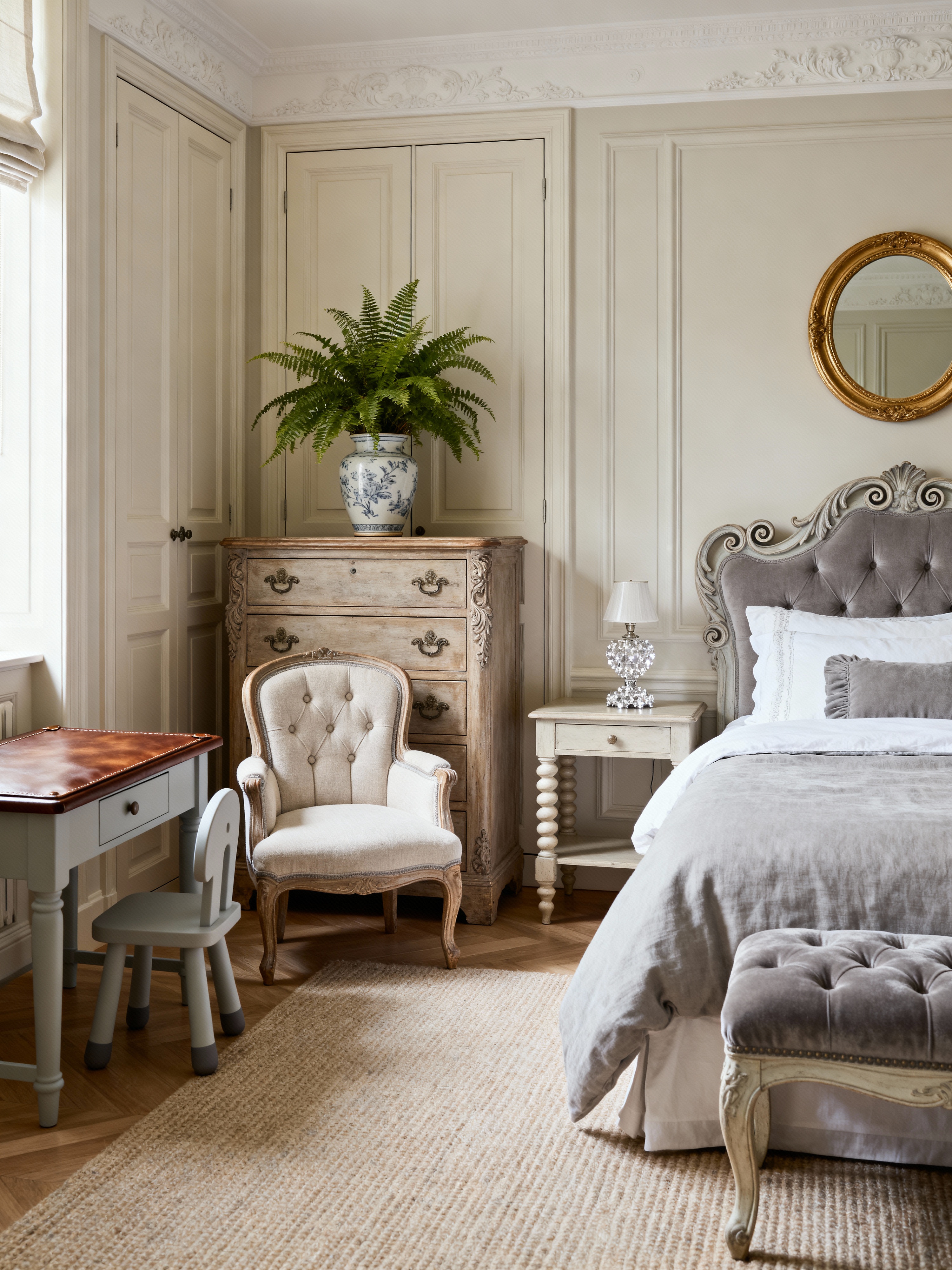kids room with parisian style with dresser closet and accent chair and headboard and plant and bedside table or night stand and mirror and kids desk and night light. . with refined style and sophisticated charm and european flair and classic details and ornate moldings and neutral palette and antique furniture and timeless beauty