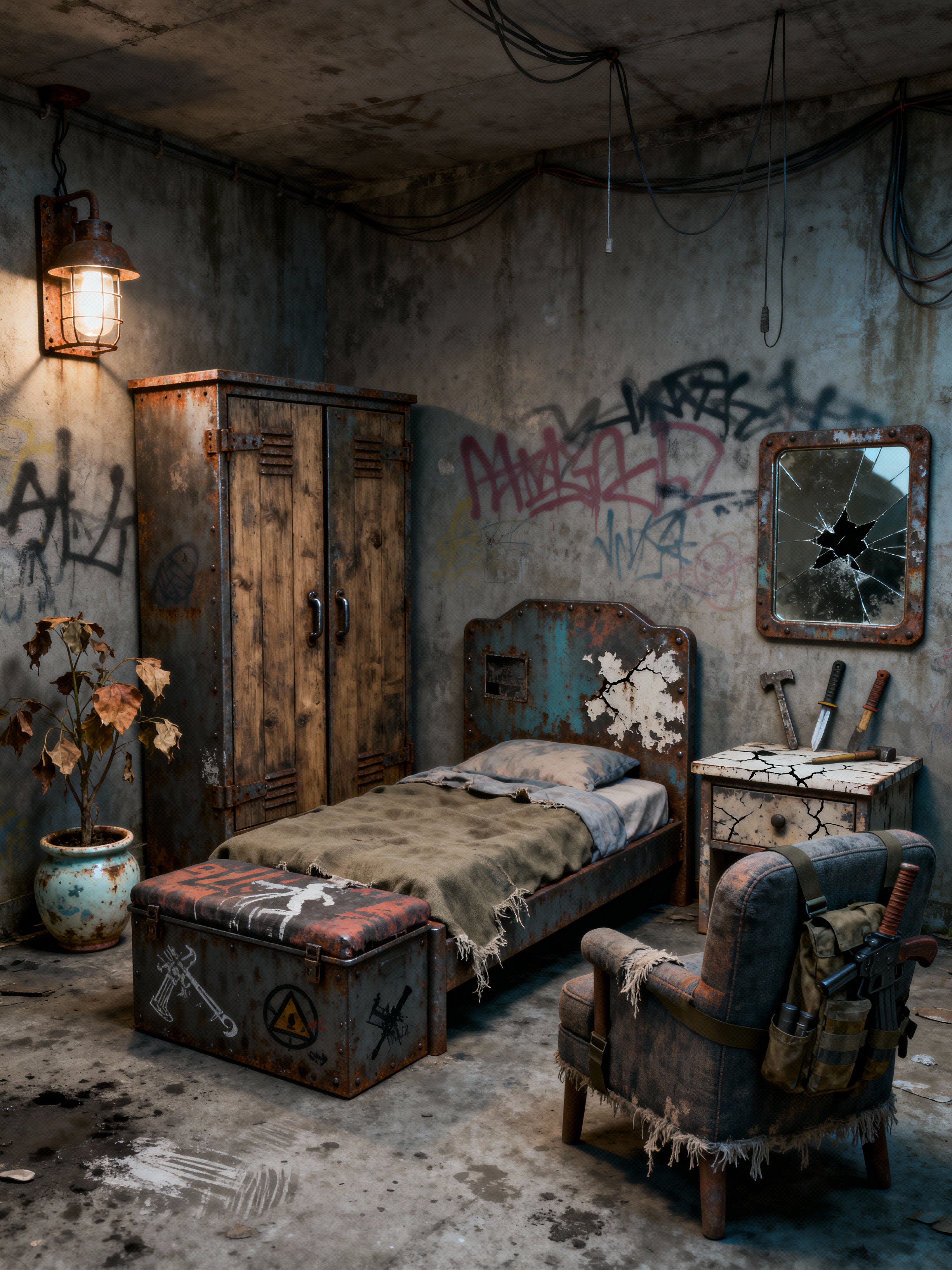 kids room with post-apocalyptic style with night light and dresser closet and headboard and storage bench or ottoman and bedside table or night stand and plant and mirror and accent chair. . with scavenged decor and urbex and survival-inspired and graffiti on walls and worn textures and hanging exposed wires and desolate and dirty floor