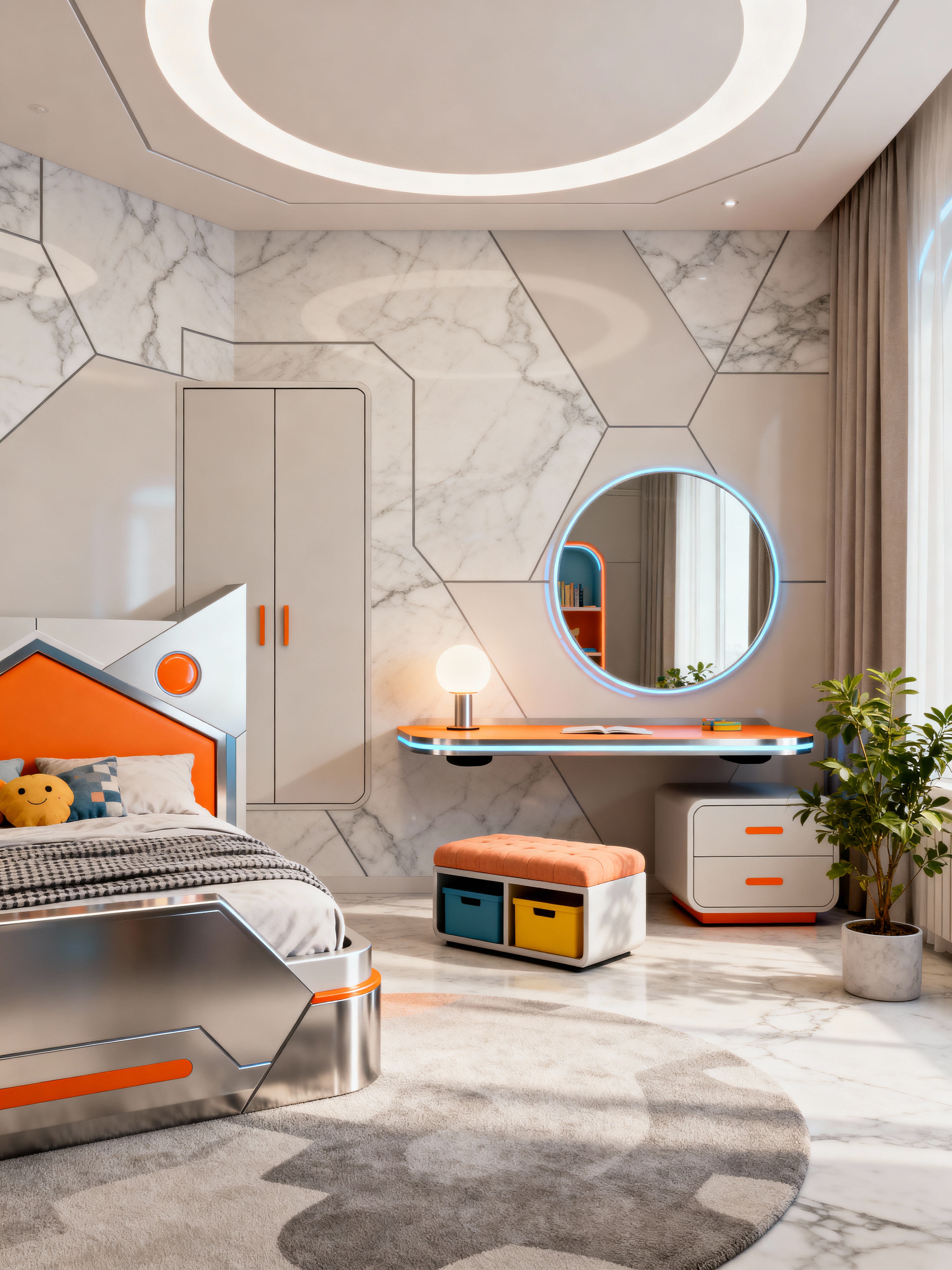 kids room with retro futuristic style with mirror and night light and headboard and kids desk and storage bench or ottoman and bed and dresser closet and plant. . with smooth marble and steel finishing and light colors and strong geometric walls and futurism minimalist interior and floating surfaces and neutral background and bright accents and circular shapes