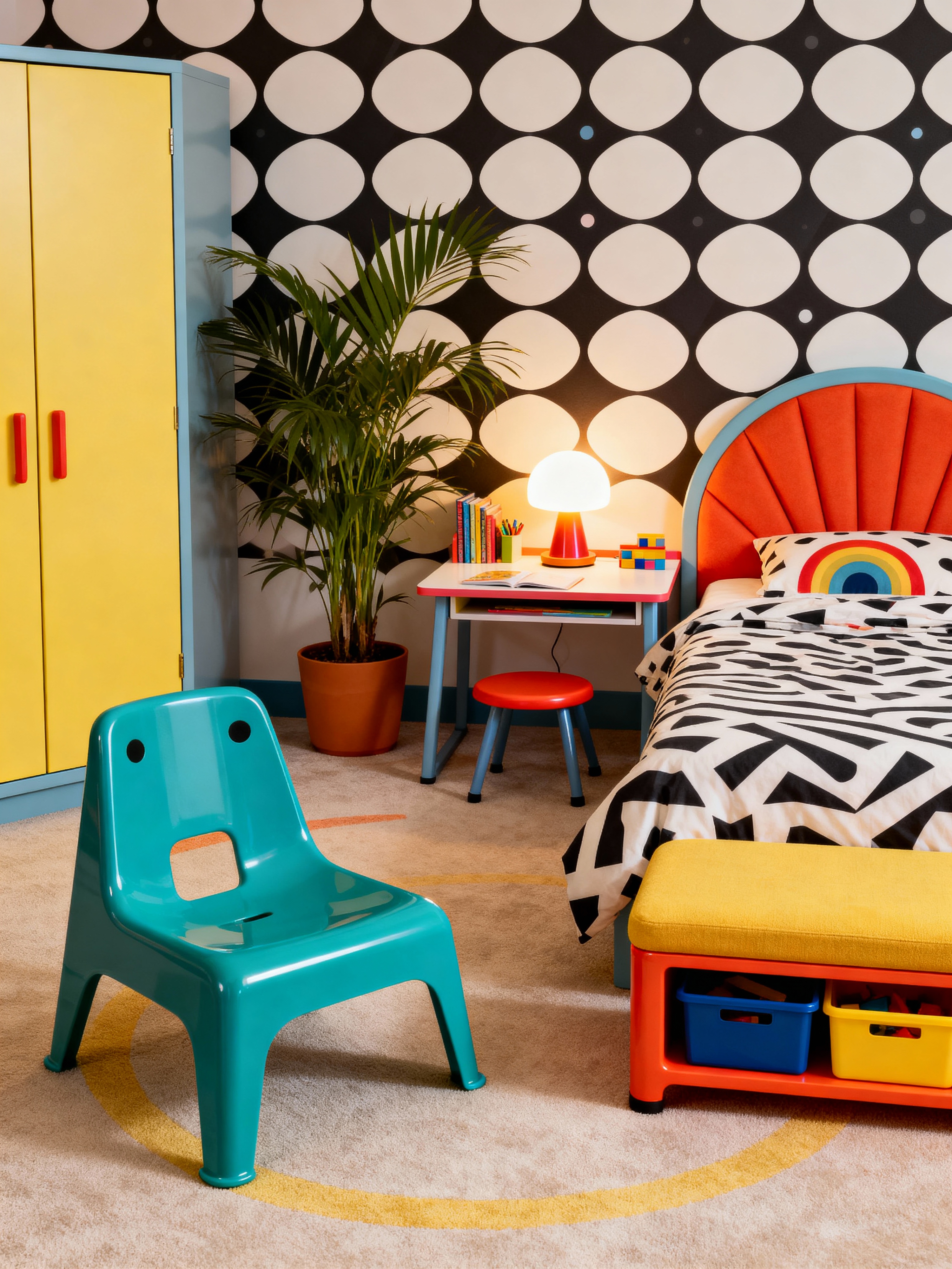 kids room with retro style with accent chair and kids desk and night light and plant and headboard and bed and dresser closet and storage bench or ottoman. . with vintage revival and funky decor and plastic furniture and geometric shapes and space age and bold patterns and bright colors and mod style