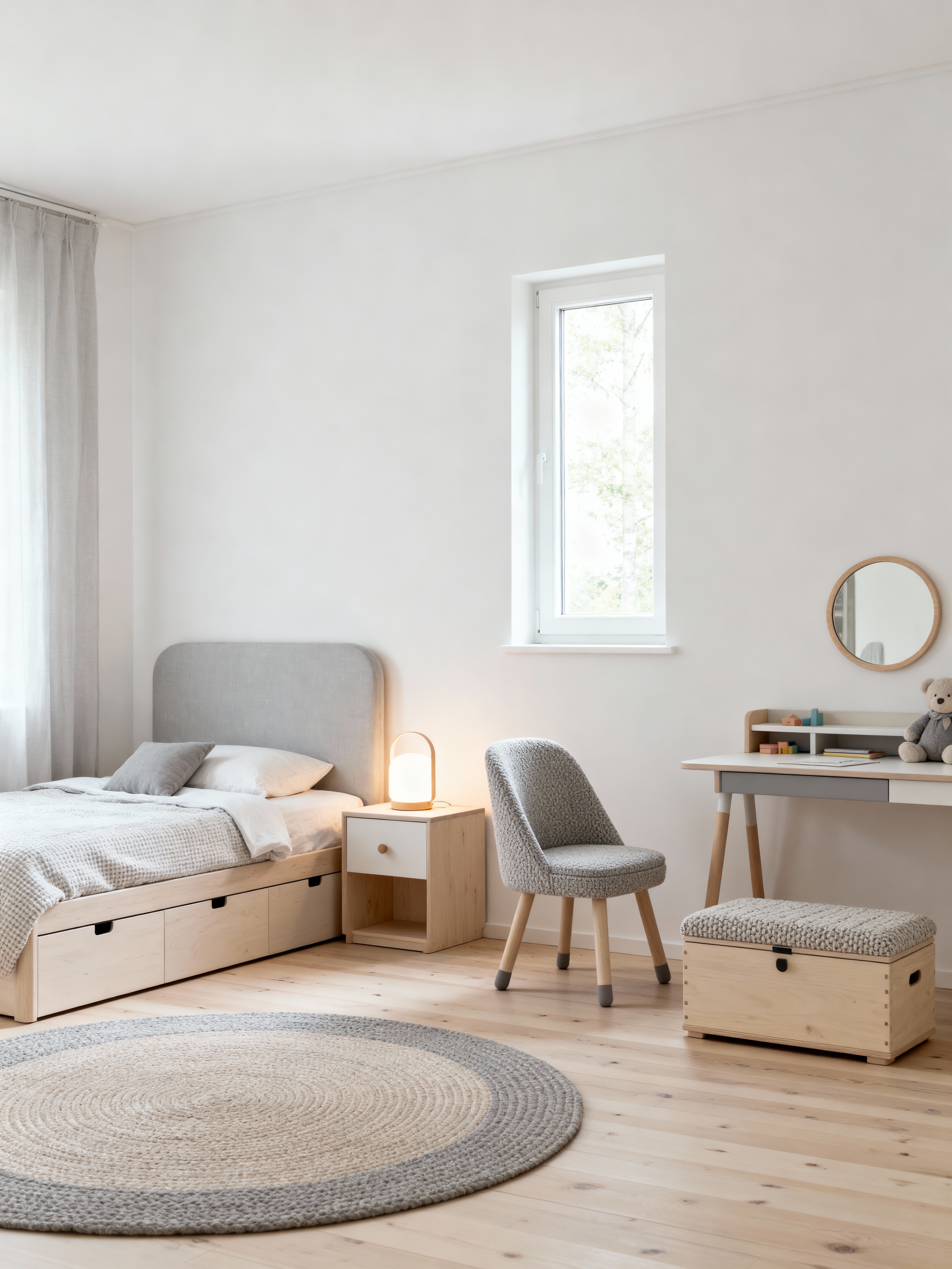 kids room with scandinavian style with headboard and accent chair and storage bench or ottoman and night light and bed and kids desk and mirror and bedside table or night stand. . with clean lines and neutral palette and hygge and light wood and functional furniture and textured fabrics and natural light and minimalist design