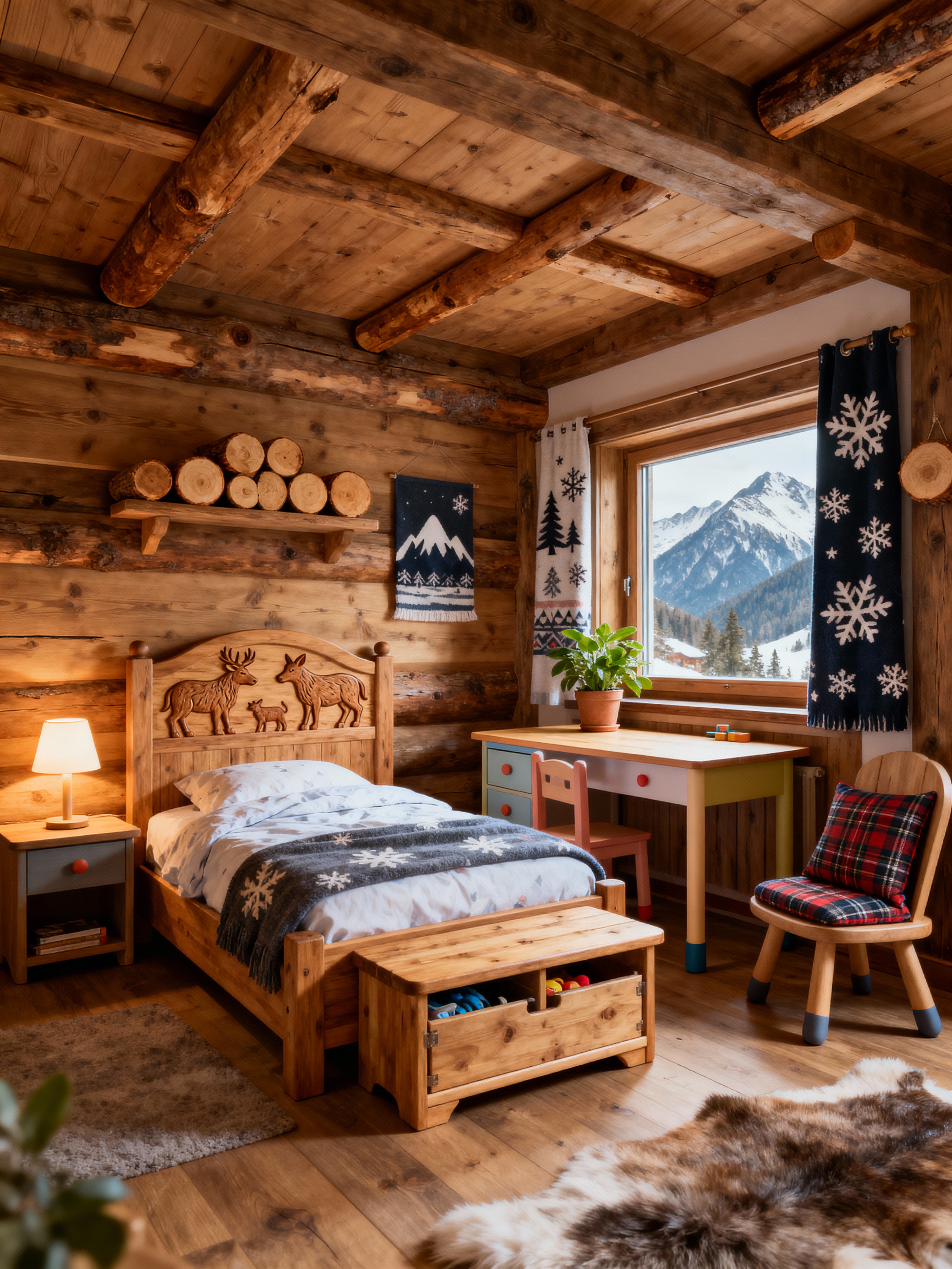 kids room with ski chalet style with bed and storage bench or ottoman and headboard and kids desk and night light and plant and bedside table or night stand and accent chair. . with wood beams and window with mountain views and mountain-inspired and wooden logs and exposed wood and animal motifs and exposed timber and wooden walls