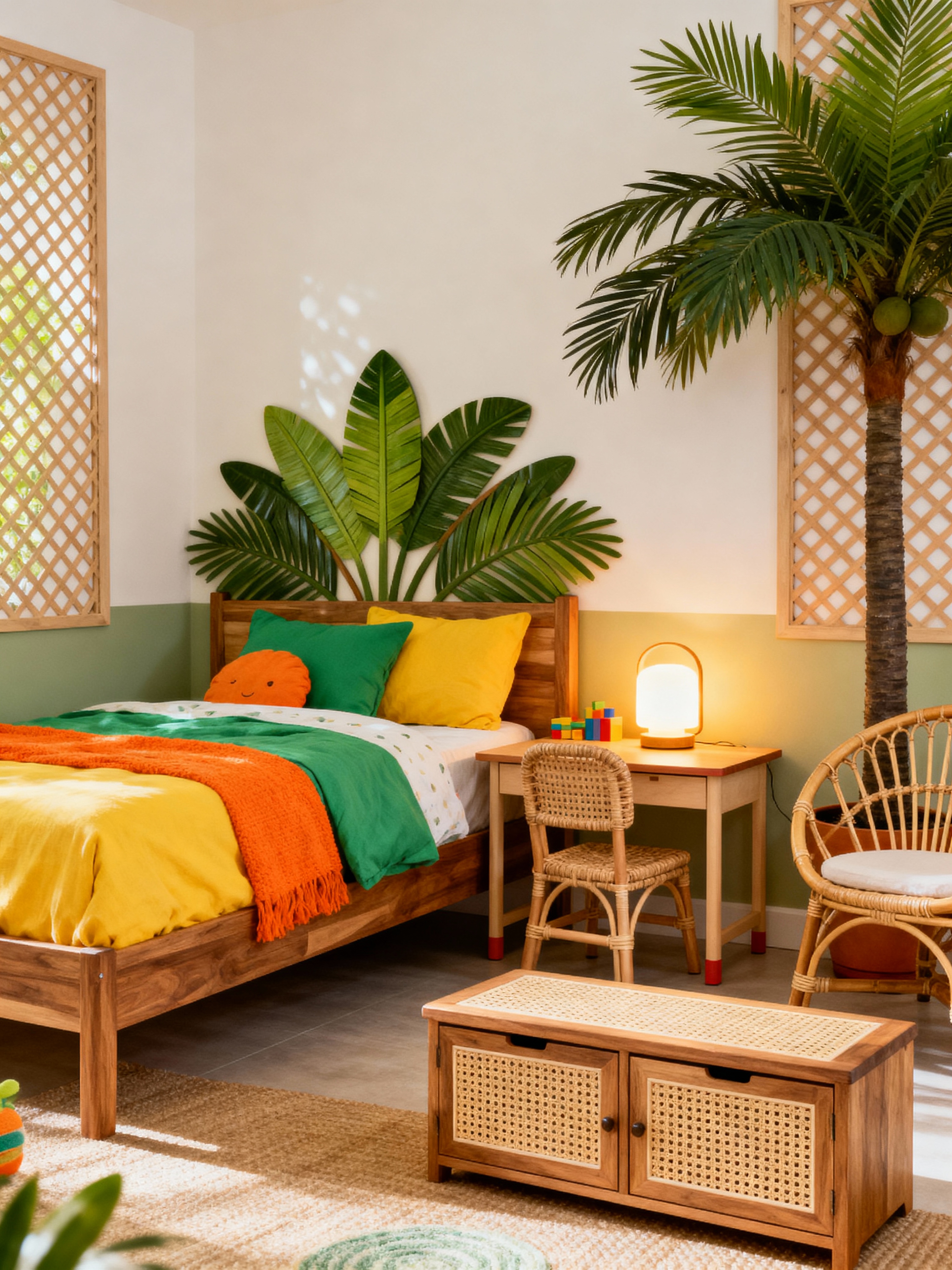 kids room with tropical style with night light and storage bench or ottoman and bed and kids desk and accent chair and headboard and plant and bedside table or night stand. . with rattan and bamboo and cane motifs and palm leaves and teak and lattice prints and wicker and palm trees