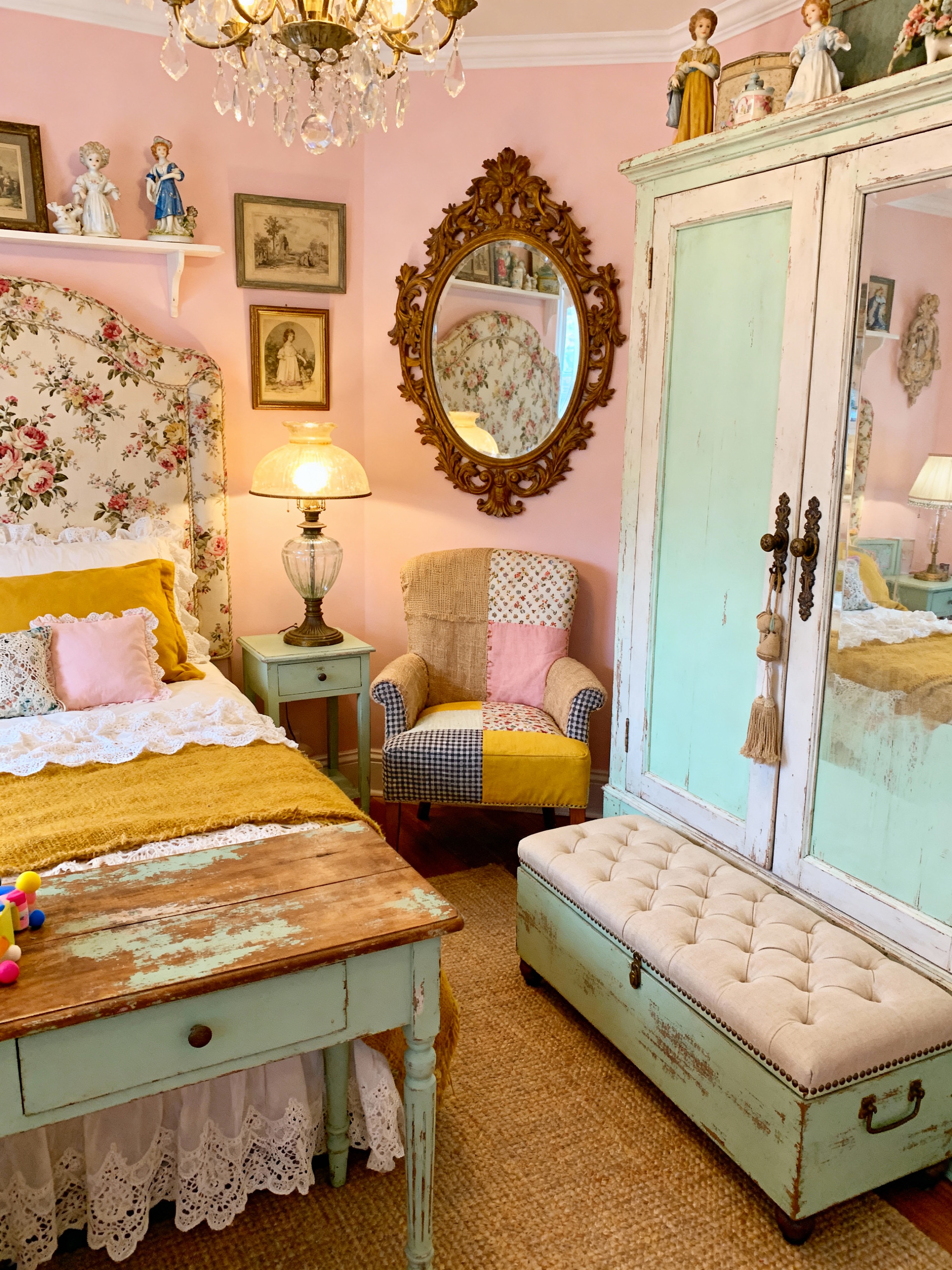 kids room with vintage style with kids desk and bed and headboard and night light and accent chair and storage bench or ottoman and mirror and dresser closet. . with timeless pieces and antique decor and retro style and eclectic and upcycled furniture and shabby chic and ornate details and colorful accents