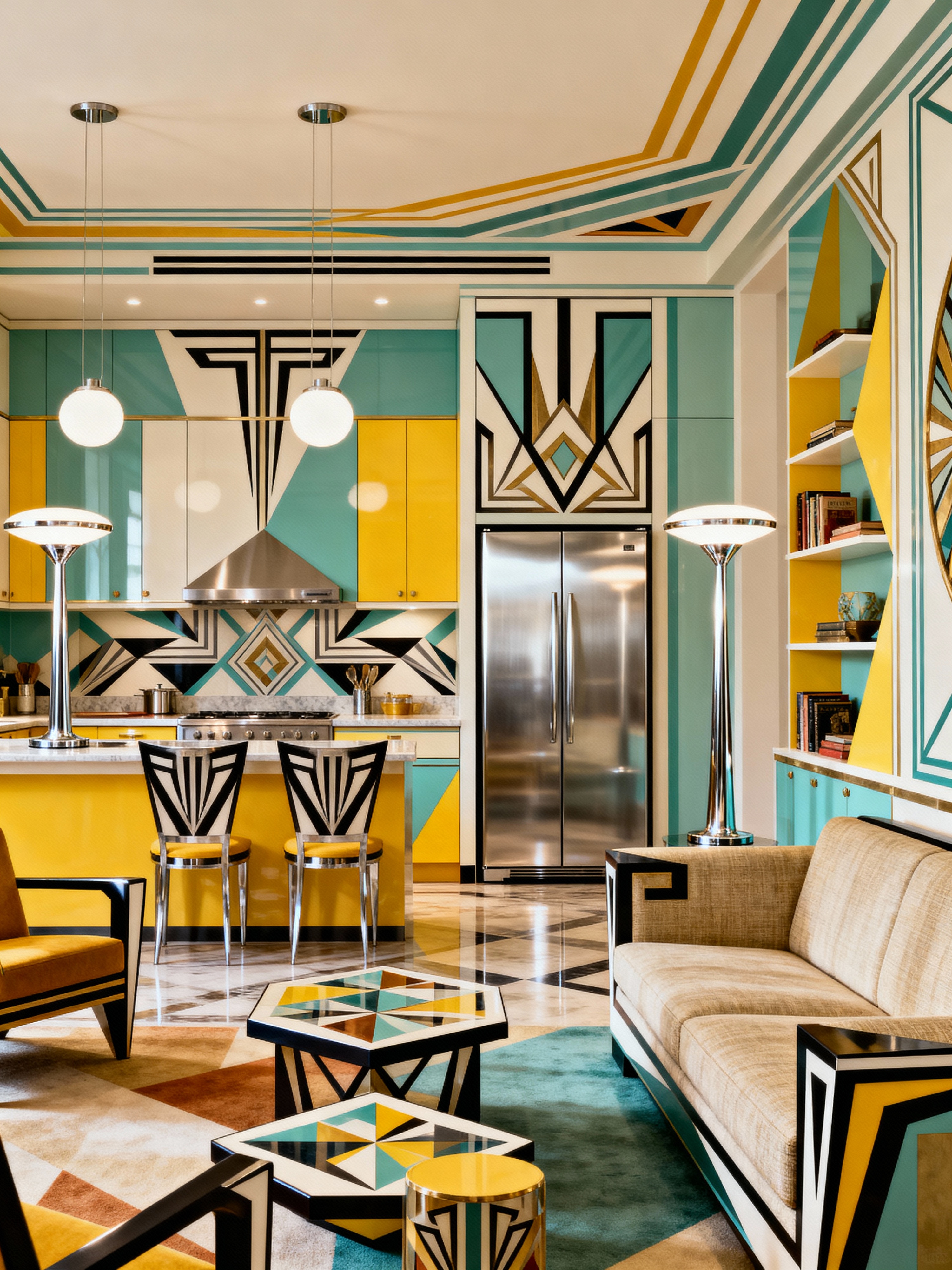 kitchen living combo with art deco style with kitchen cabinets and furniture and electric lamps and sofa and chairs and refrigerator and coffee tables and bookshelves. . with geometric lines and bright and cheerful colors and geometric shapes and bold geometry and stream-lined forms and angular shapes and symmetrical designs and smooth lines