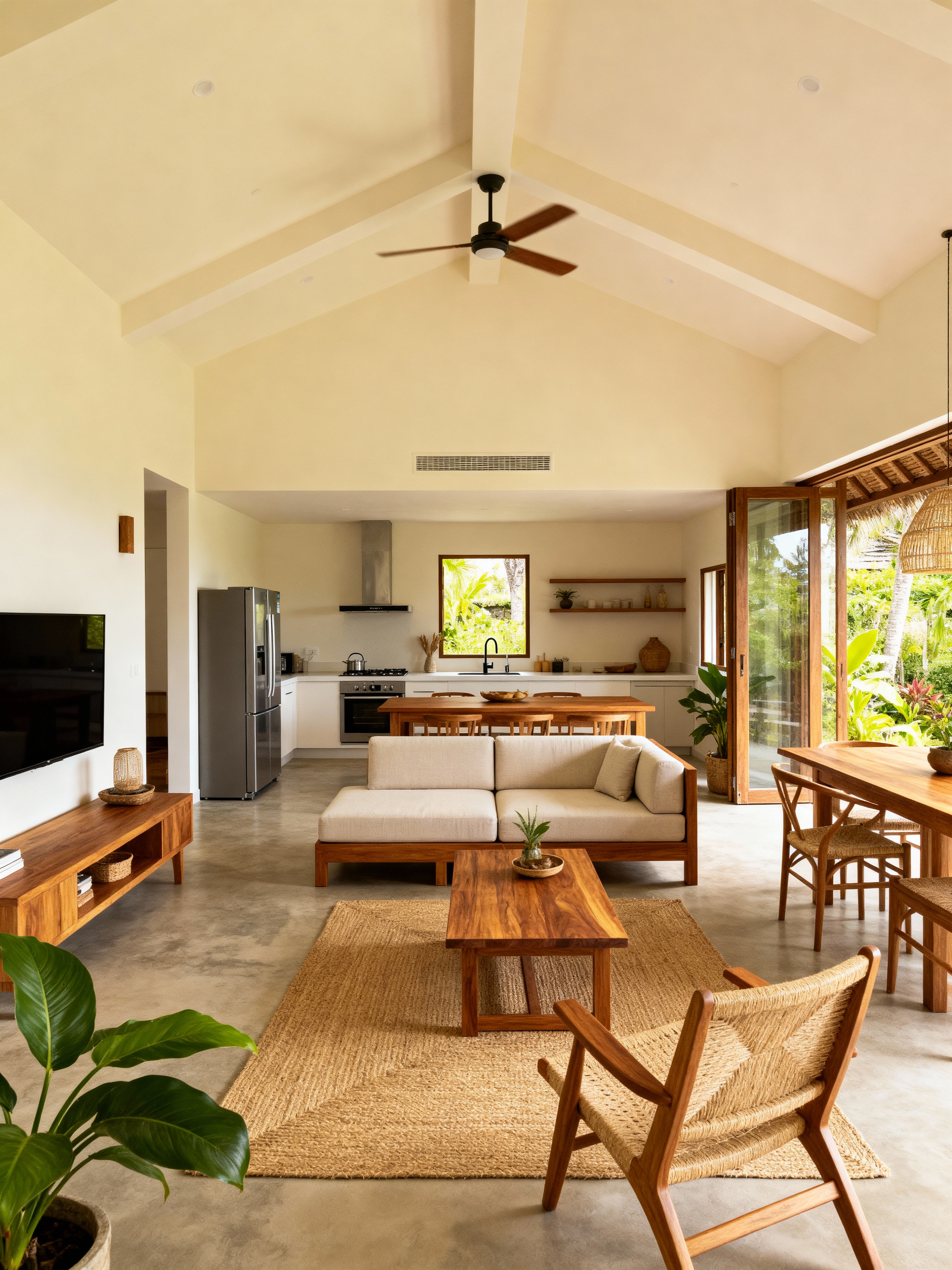 kitchen living combo with bali style with refrigerator and televisions and sink and plant and coffee tables and chairs and occasional tables and stove. . with open high ceilings with fans and light wood furniture (teak, oak) and indoor-outdoor flow with glass doors and woven rugs (jute, seagrass) and wooden coffee and dining tables and white or cream walls and microcement floors and low modular sofas