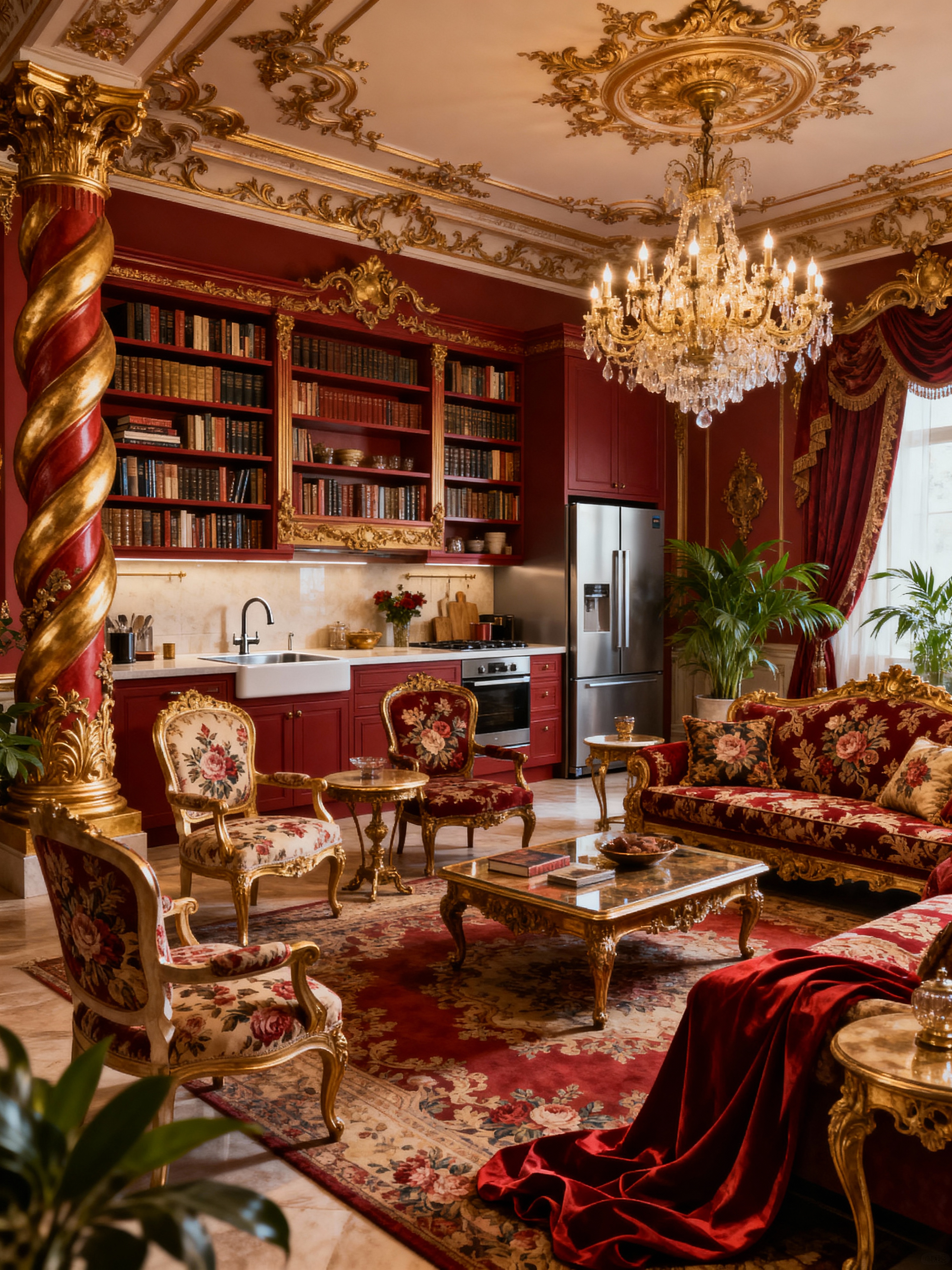 kitchen living combo with baroque style with bookshelves and chairs and occasional tables and sink and coffee tables and refrigerator and sofa and plant. . with dynamism and elaborate ornamentation and luxurious floral and damask fabrics and grandeur and twisted columns and drama and emotional exuberance and movement