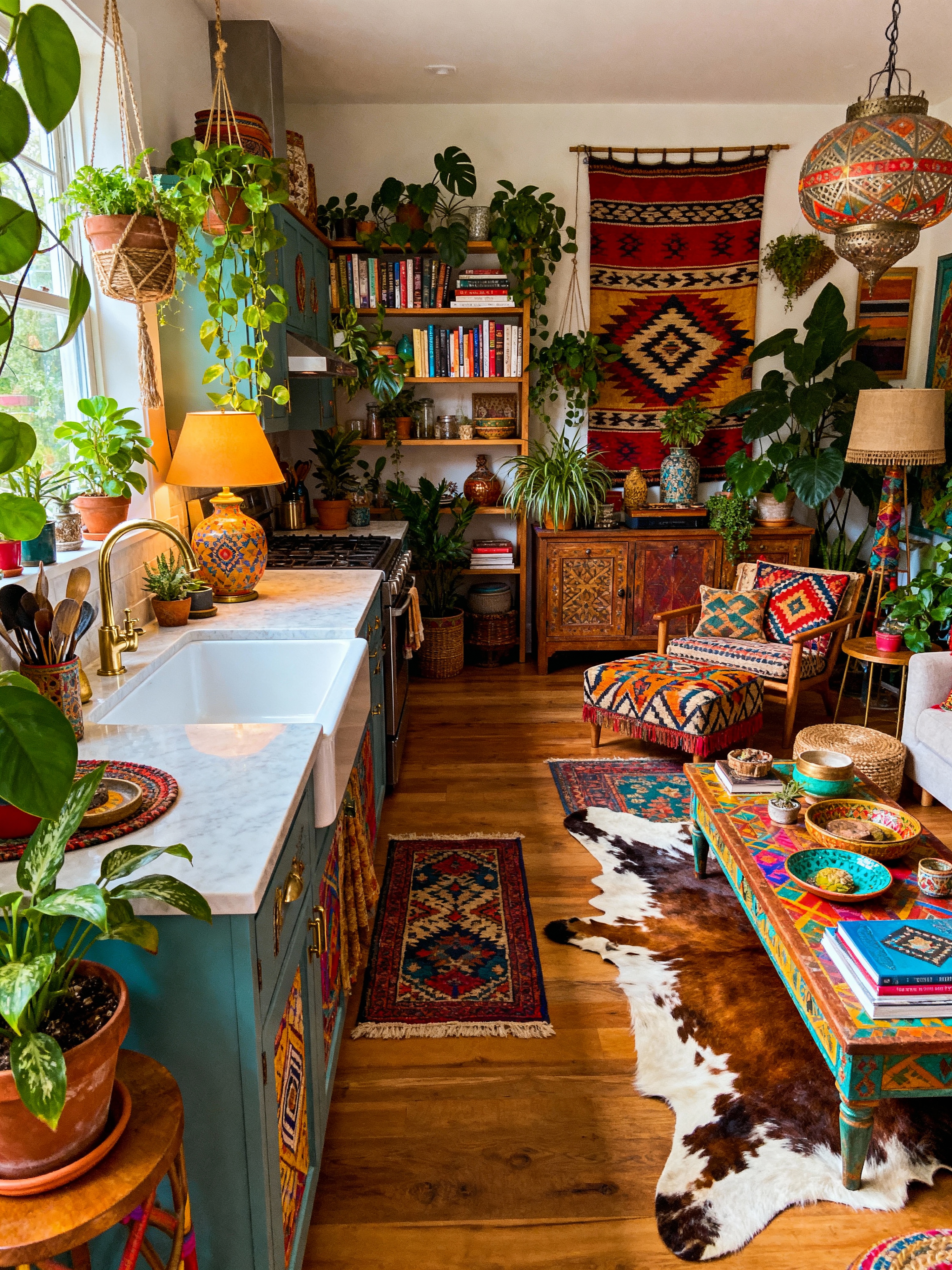 kitchen living combo with bohemian style with sink and plant and electric lamps and bookshelves and furniture and kitchen cabinets and coffee tables and rug. . with lush green nature and bold colors and carefree layers of pattern, texture, and color and playful textures and bold patterns and metals and natural materials and animal hides