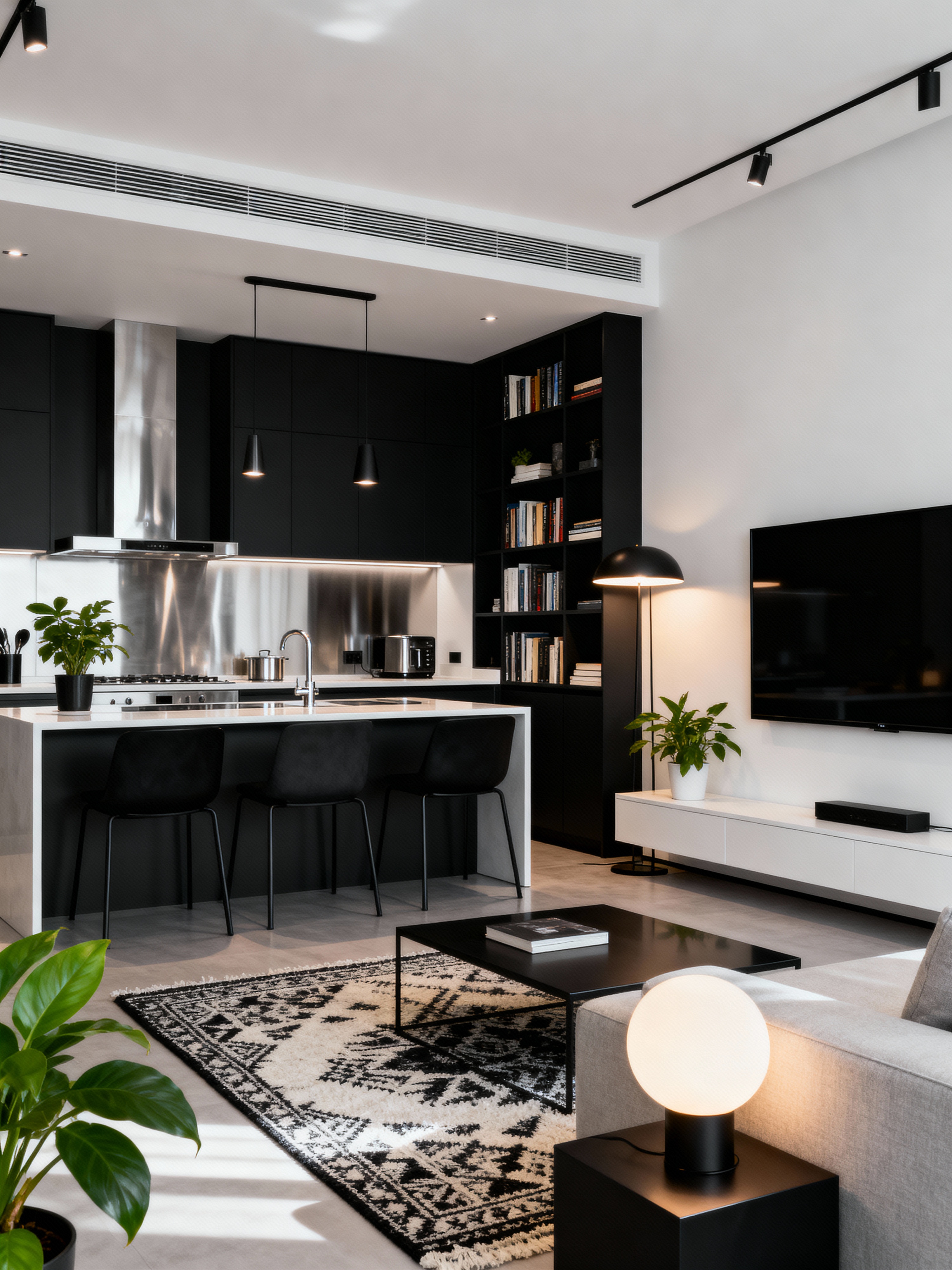 kitchen living combo with contemporary style with electric lamps and plant and rug and worktops and chairs and bookshelves and plant and televisions. . with open spaces and clean look and functional design and minimalist and high contrast and metal accents and elegant simplicity and sleek lines