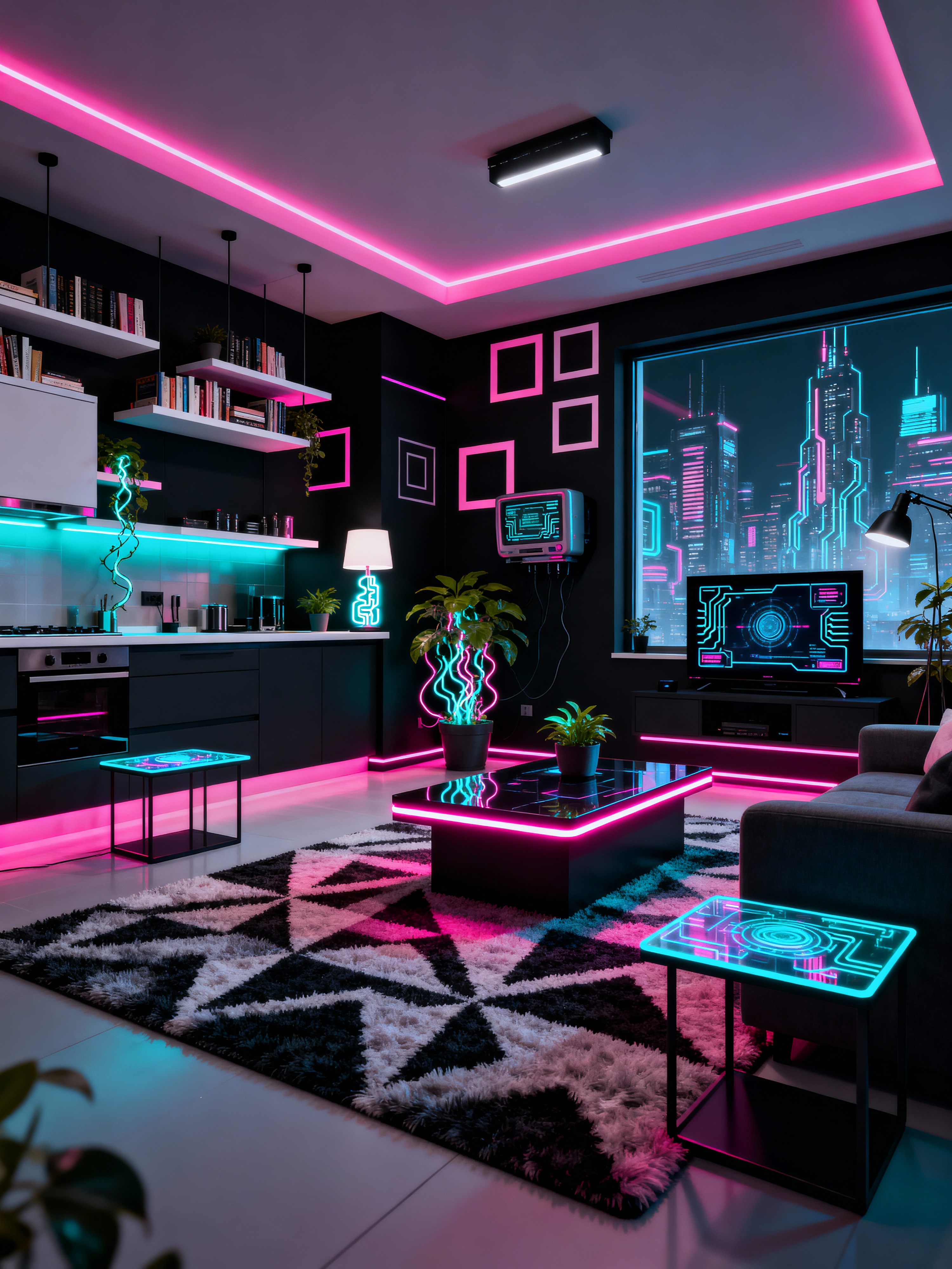 kitchen living combo with cyberpunk style with bookshelves and rug and occasional tables and plant and coffee tables and televisions and electric lamps and plant. . with strong geometric walls and cyberpunk lights and futuristic cybernetic city and clean straight square lines and black lights and cyberpunk lights and futuristic cybernetic details and synthwave