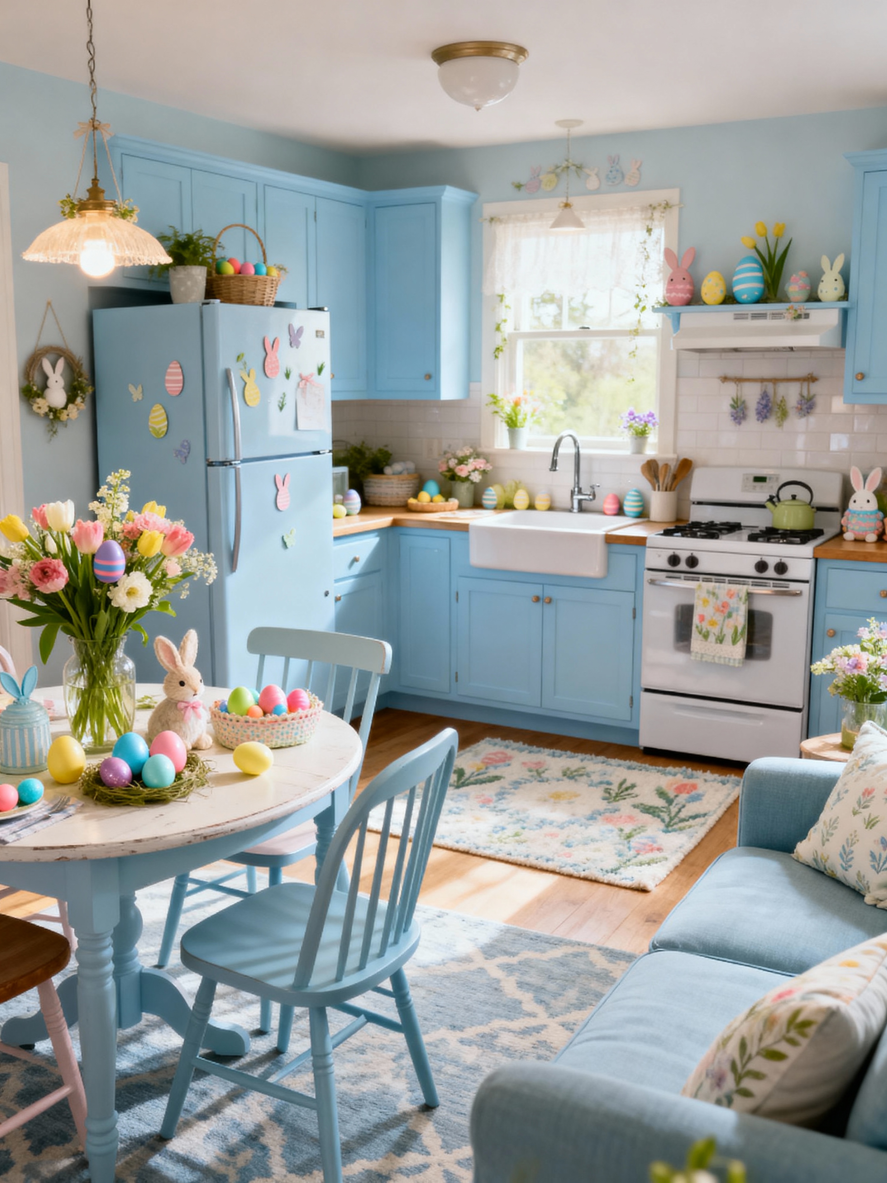 kitchen living combo with easter style with refrigerator and chairs and sofa and kitchen cabinets and rug and stove and sink and furniture. . with light blue colors and flowers on table and colorful easter eggs and easter decorations and spring decorations and light blue colors