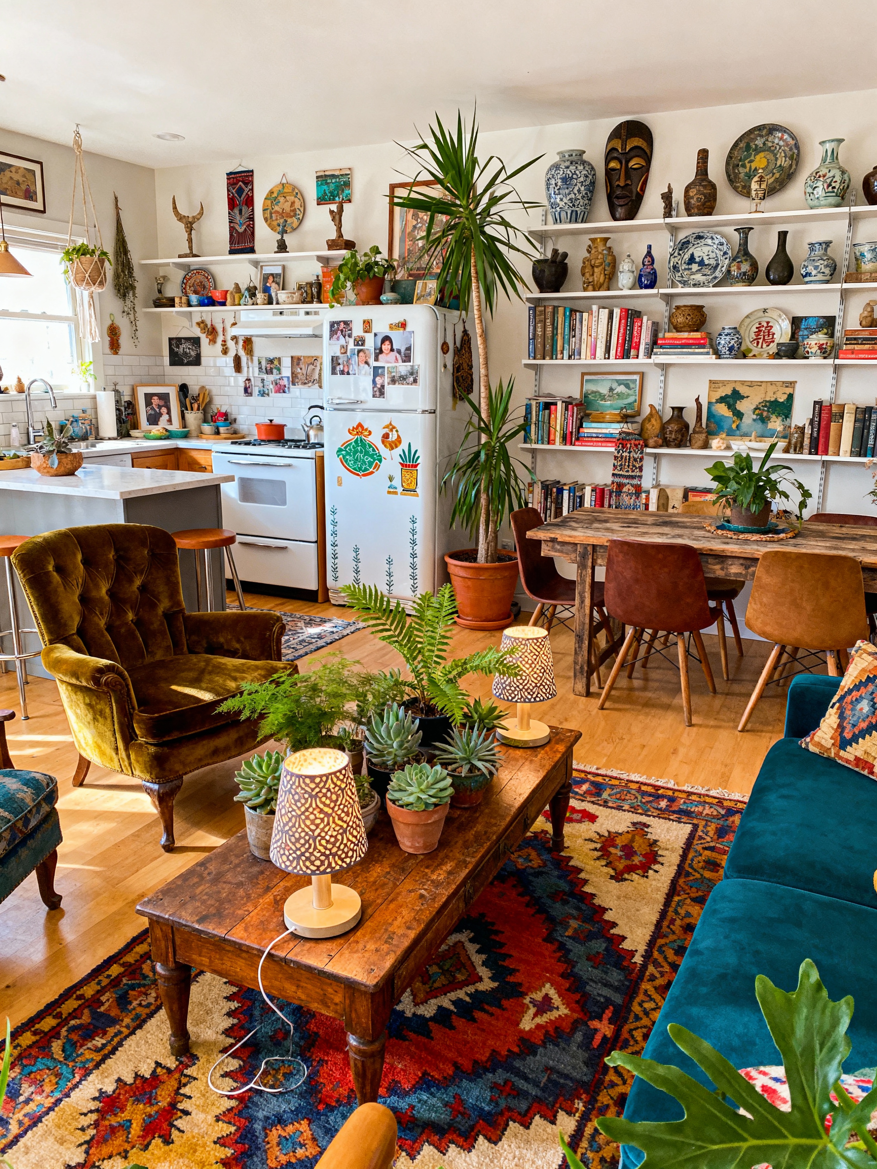 kitchen living combo with eclectic style with coffee tables and electric lamps and rug and plant and furniture and plant and refrigerator and bookshelves. . with vintage finds and artistic flair and personal expression and global influences and creative freedom and layered textures and bold combinations and mixed styles