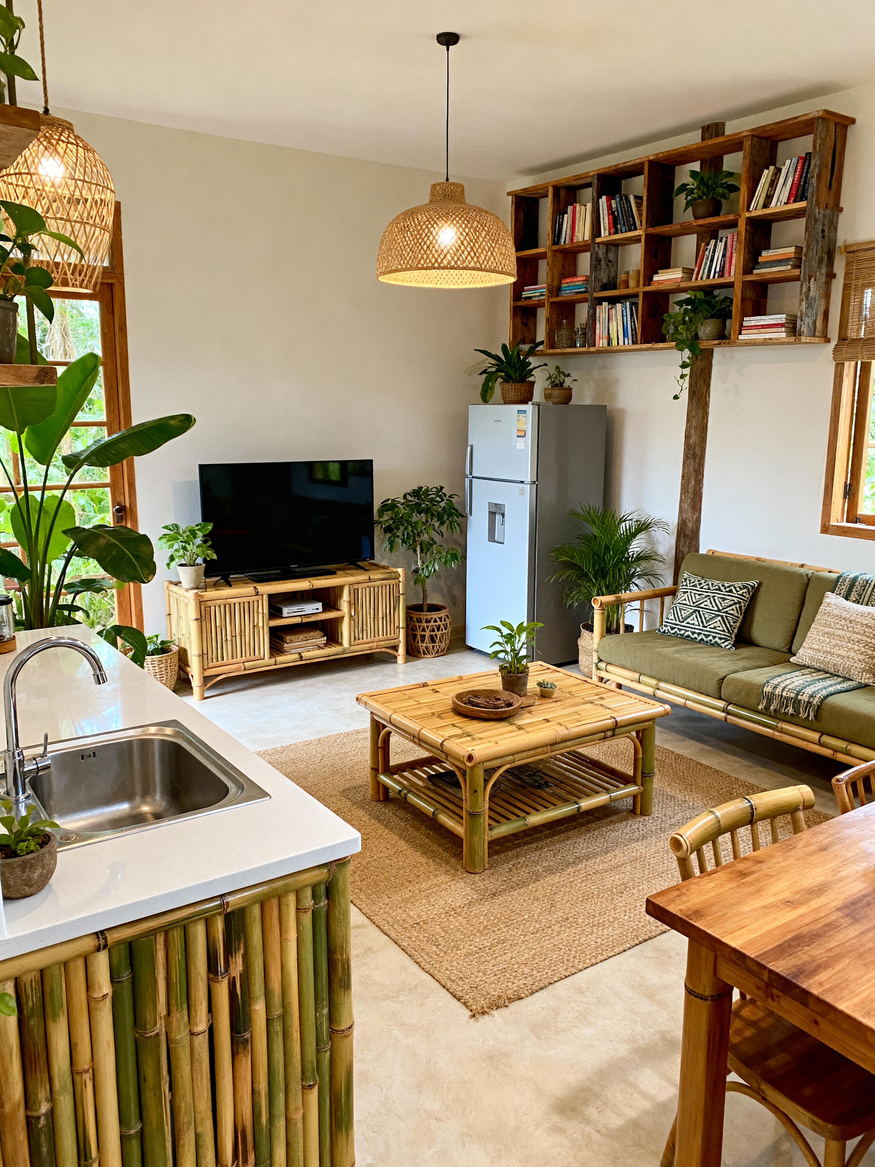kitchen living combo with eco-friendly style with coffee tables and sink and televisions and sofa and bookshelves and plant and refrigerator and occasional tables. . with energy efficient and renewable resources and bamboo furniture and green living and environmentally conscious and sustainable materials and organic textiles and recycled elements