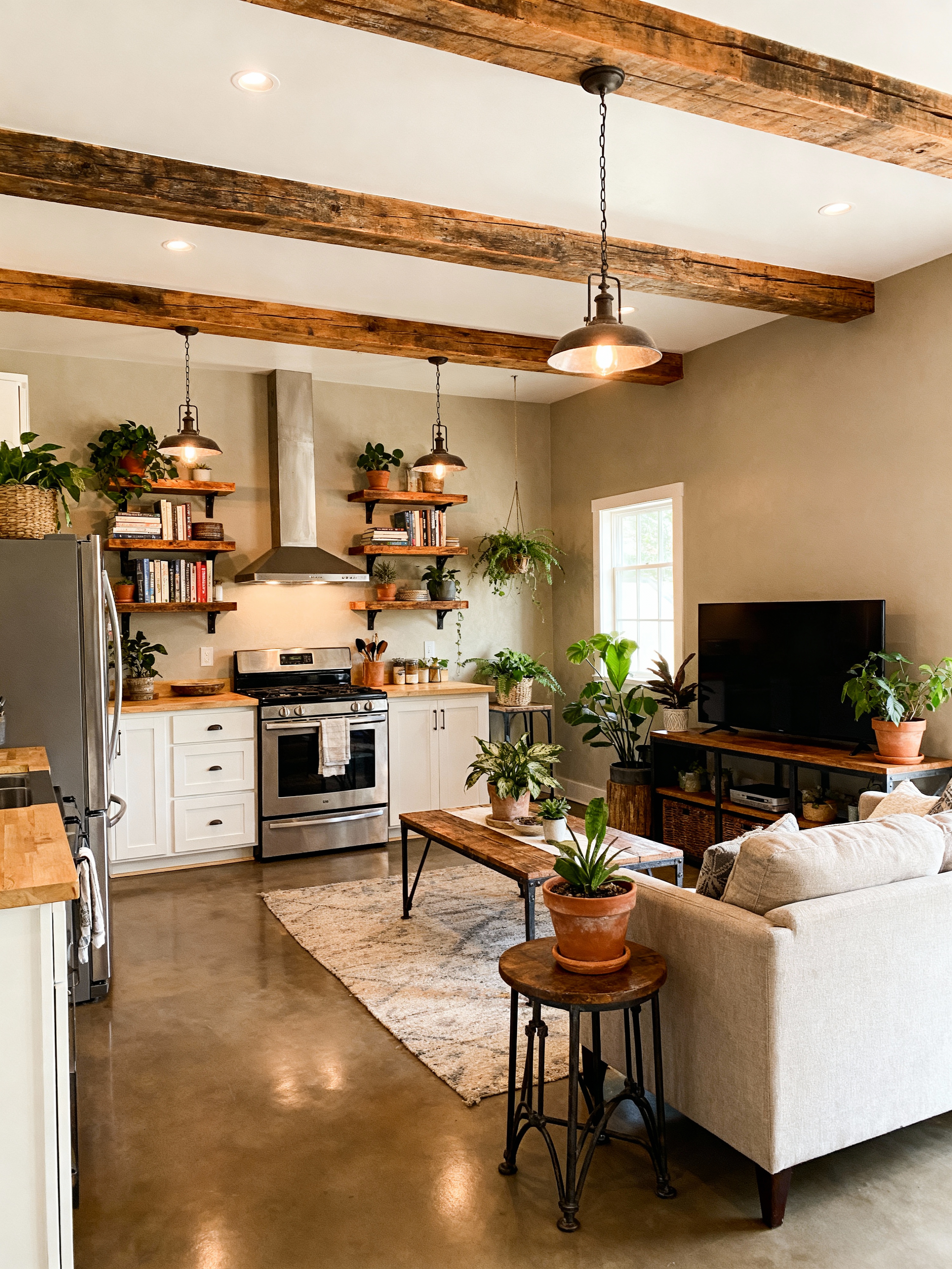 kitchen living combo with farmhouse style with plant and stove and bookshelves and refrigerator and plant and televisions and sofa and coffee tables. . with natural textures and country style and cozy feel and industrial accents and neutral tones and exposed wood and open shelving and rustic charm