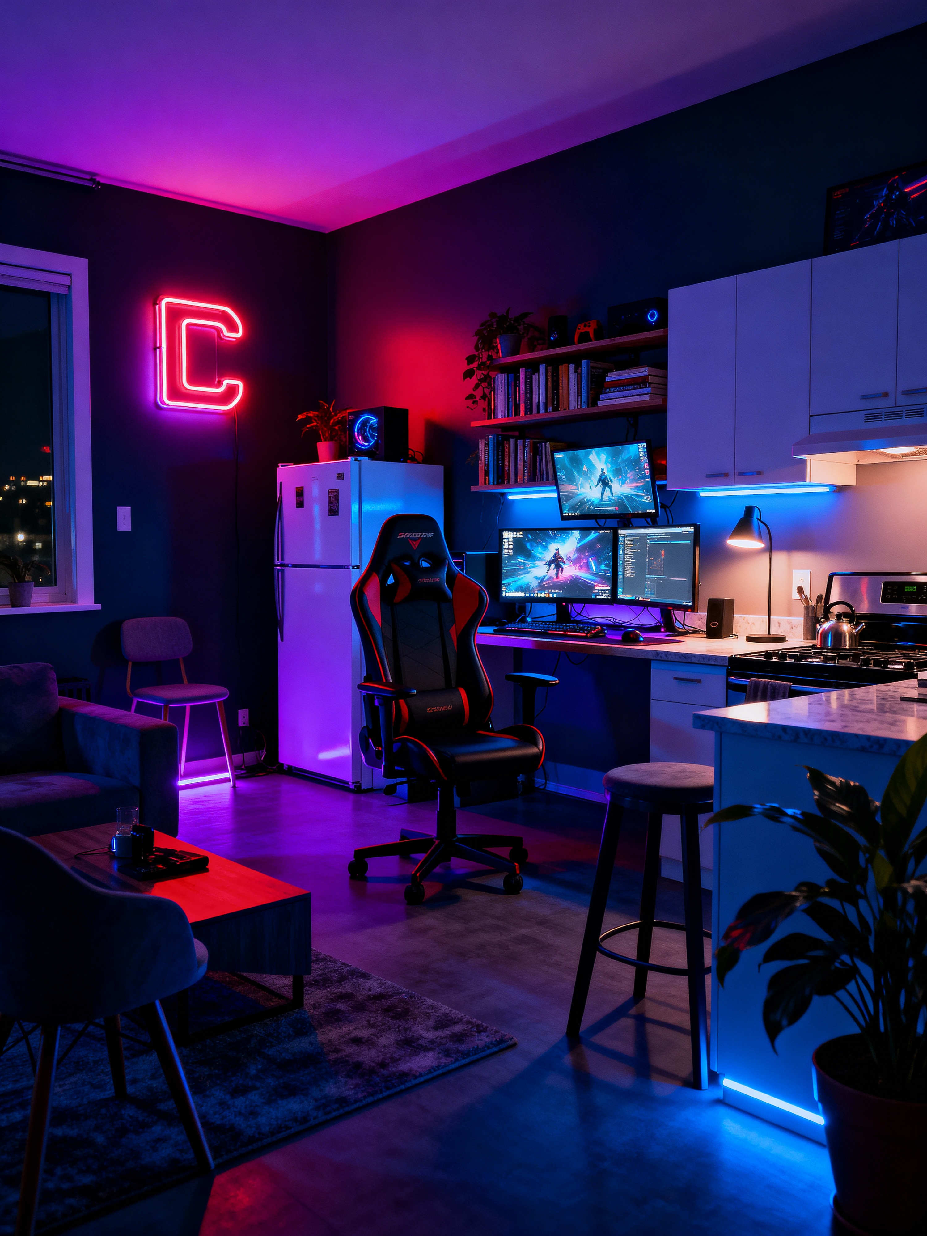 kitchen living combo with gaming room style with chairs and refrigerator and worktops and bookshelves and electric lamps and stove and furniture and plant. . with multiple displays and neon letters on wall and at night and dark room and purple, red and blue fade light and gaming chair and neon lights and dark lit room