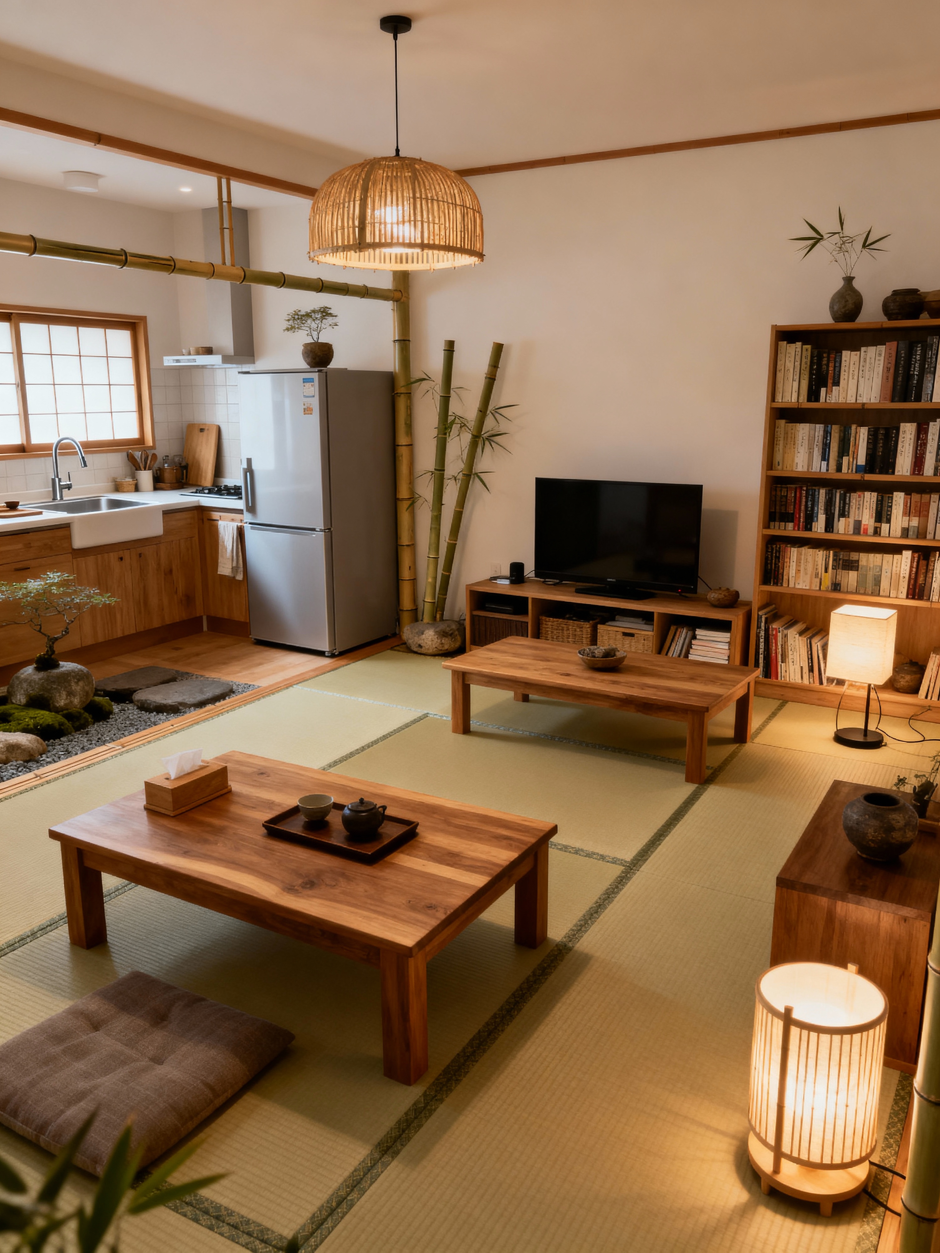 kitchen living combo with japanese design style with bookshelves and occasional tables and coffee tables and televisions and sink and electric lamps and refrigerator and furniture. . with zen decor and natural materials and low furniture and wabi-sabi and tatami mats and minimalism and bamboo accents and tranquility