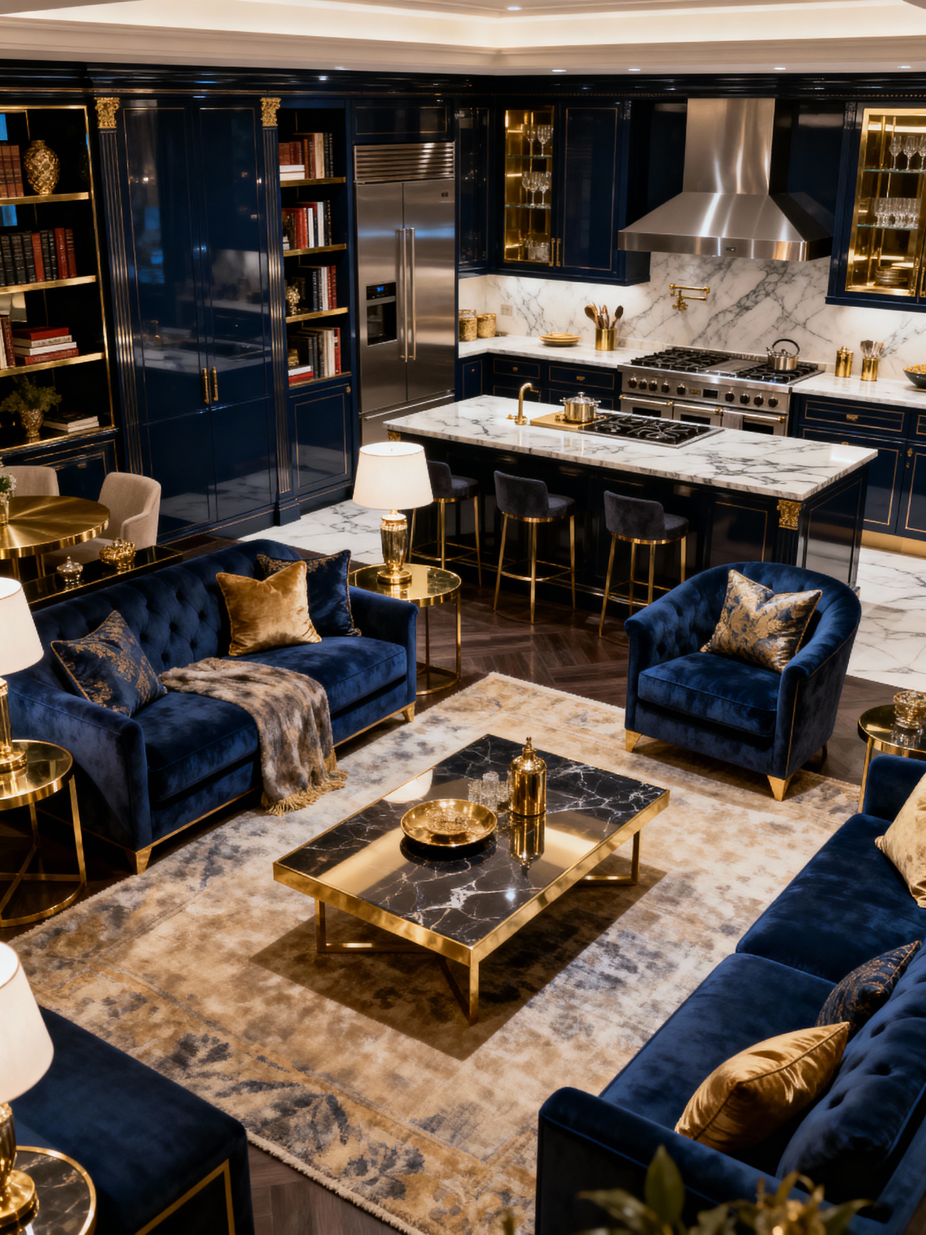 kitchen living combo with luxury style with rug and occasional tables and coffee tables and stove and furniture and kitchen cabinets and bookshelves and electric lamps. . with sophisticated style and exclusive design and lavish comfort and designer furniture and expensive fabrics and custom pieces and premium finishes and high-end materials
