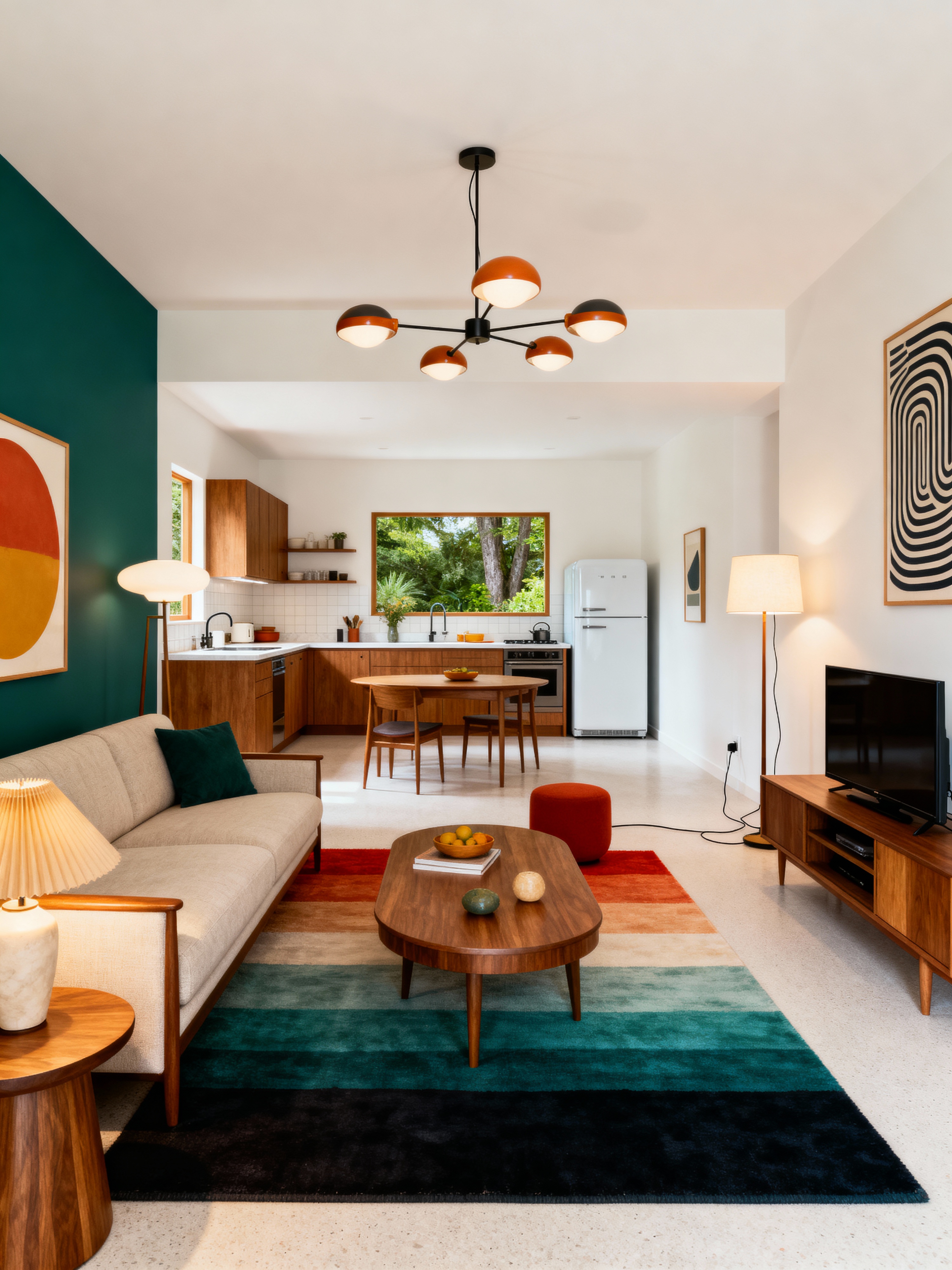 kitchen living combo with midcentury modern style with televisions and electric lamps and worktops and refrigerator and rug and occasional tables and coffee tables and sofa. . with minimalist and nature indoors and integrating indoor and outdoor motifs and mid century modern mobile chandelier and graphic shapes and function over form and organic and geometric shapes and vibrant colors