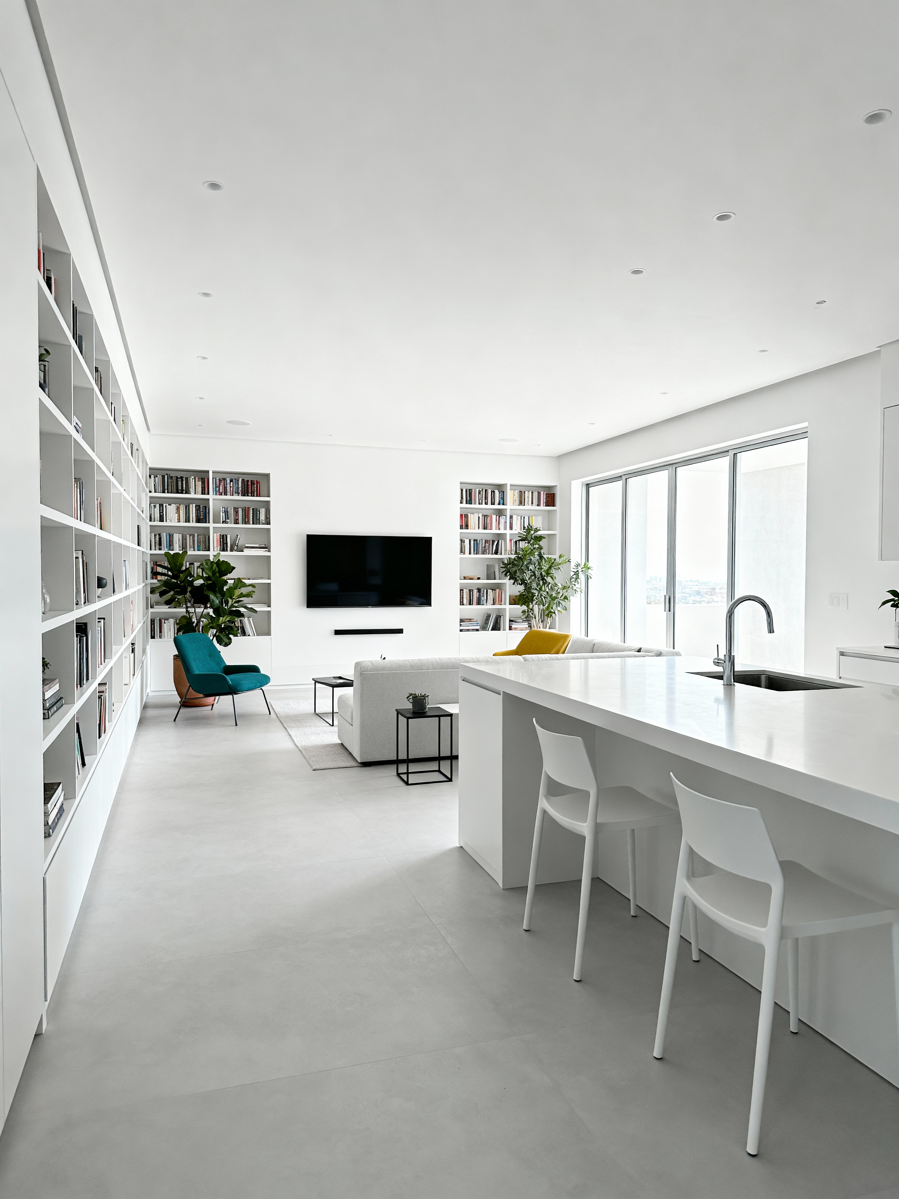 kitchen living combo with minimalist style with bookshelves and televisions and plant and worktops and chairs and sink and occasional tables and plant. . with lots of light and clean lines and focus on the shape, colour and texture of just a few of essential elements and a monochromatic palette with colour used as an accent and an open floor plan and functional furniture and lots of light