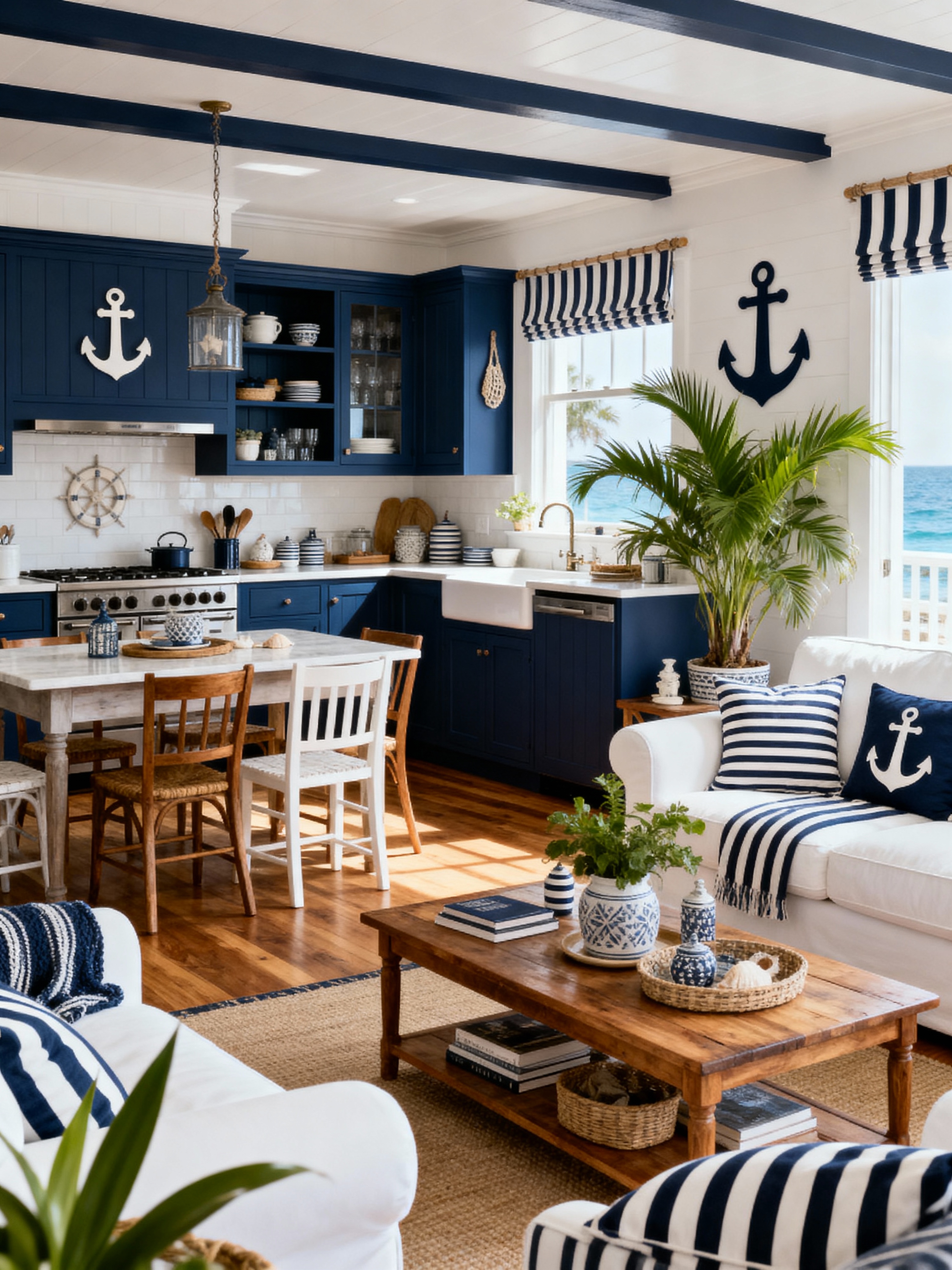 kitchen living combo with nautical style with occasional tables and kitchen cabinets and sofa and worktops and stove and furniture and coffee tables and plant. . with navy blue and striped patterns and seaside charm and maritime decor and crisp white and anchor motifs and coastal vibes and ocean inspiration