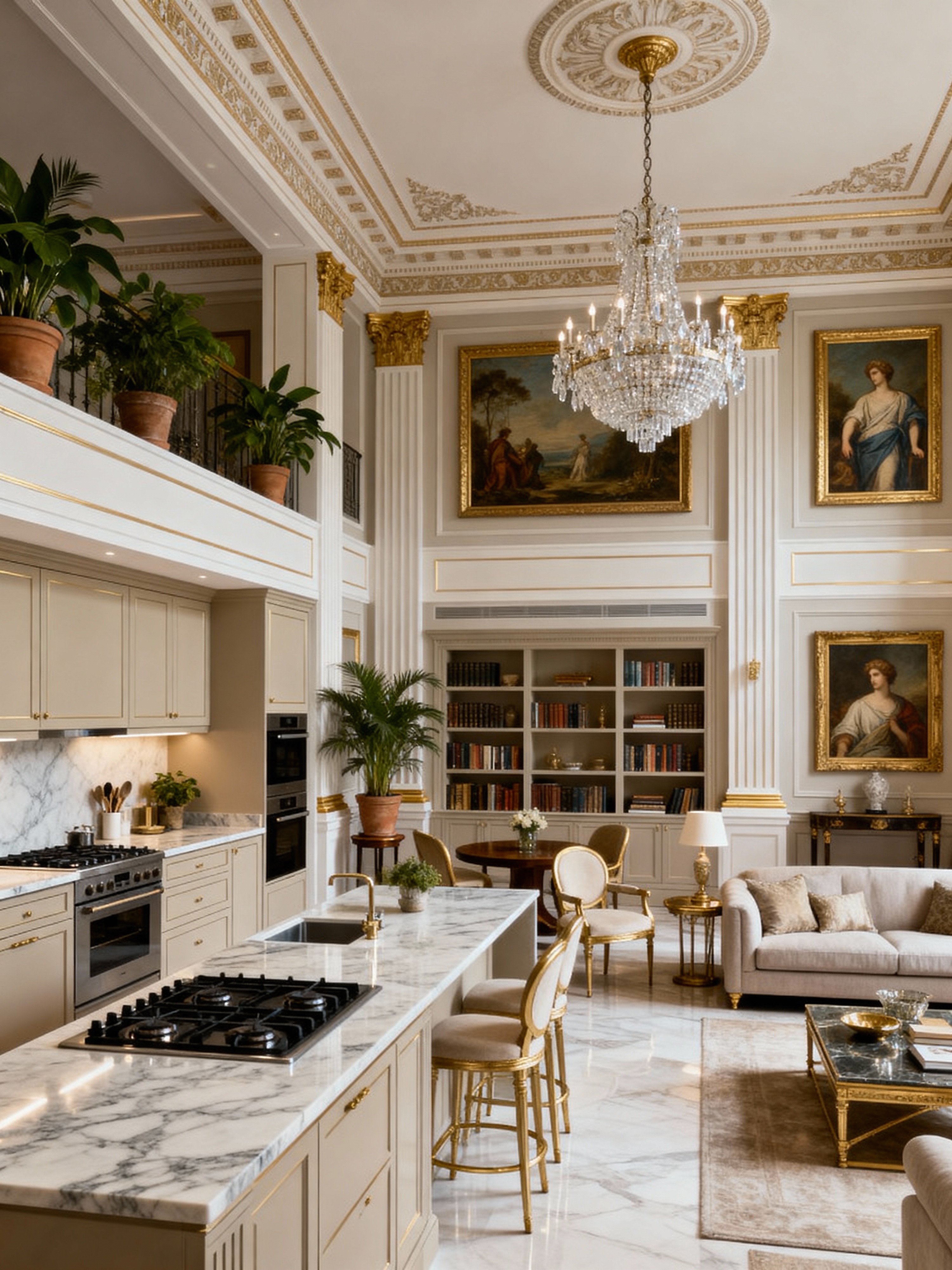 kitchen living combo with neoclassic style with kitchen cabinets and plant and sofa and bookshelves and chairs and occasional tables and stove and coffee tables. . with symmetric layouts and emphasized horizontal and vertical lines and geometric decorative elements and timeless artwork and classical architectural details and timeless furniture and elegant and sophisticated and high ceilings