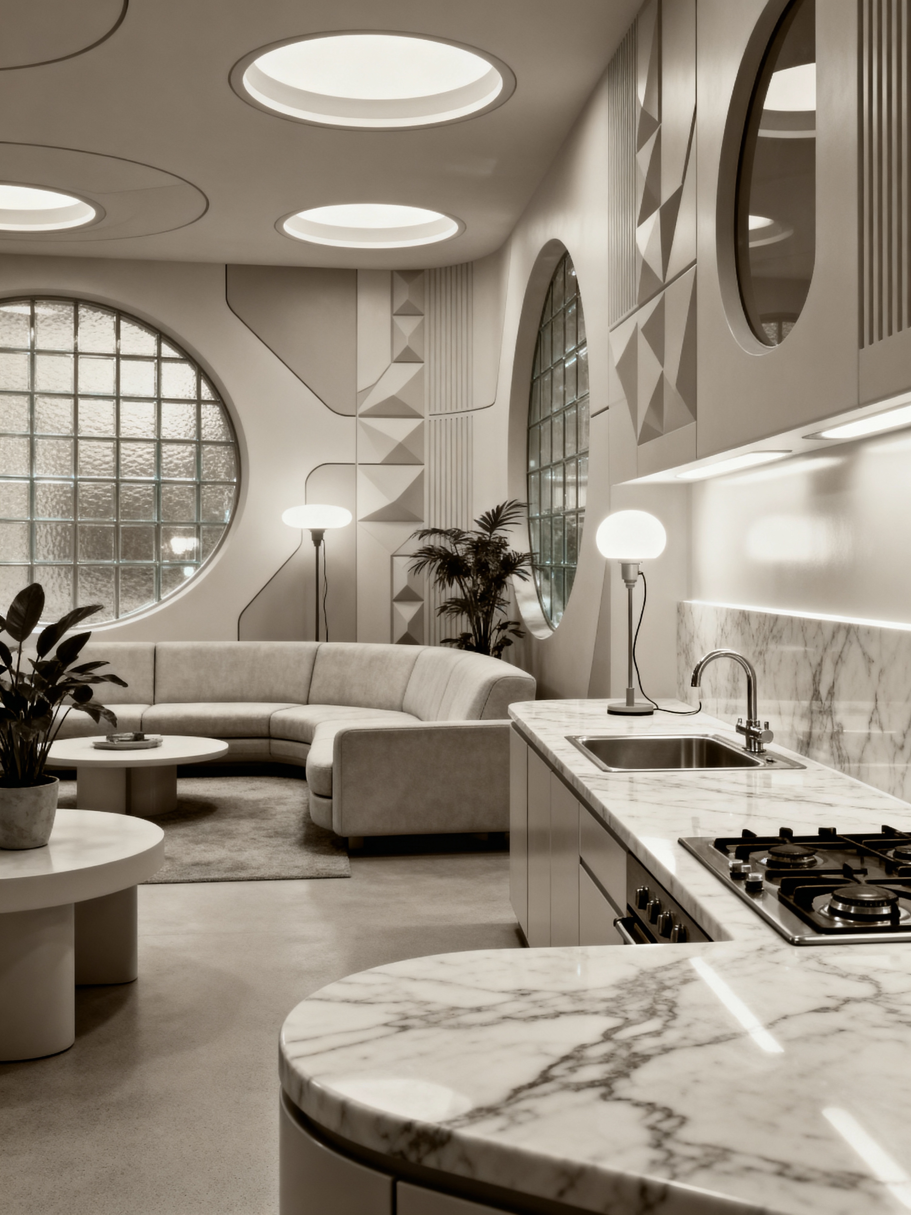 kitchen living combo with retro futuristic style with plant and sofa and furniture and plant and sink and stove and electric lamps and worktops. . with glass panes and circular shapes and monochromatic palette and vintage futurism and smooth marble and minimalist clean lines and strong geometric walls and light colors