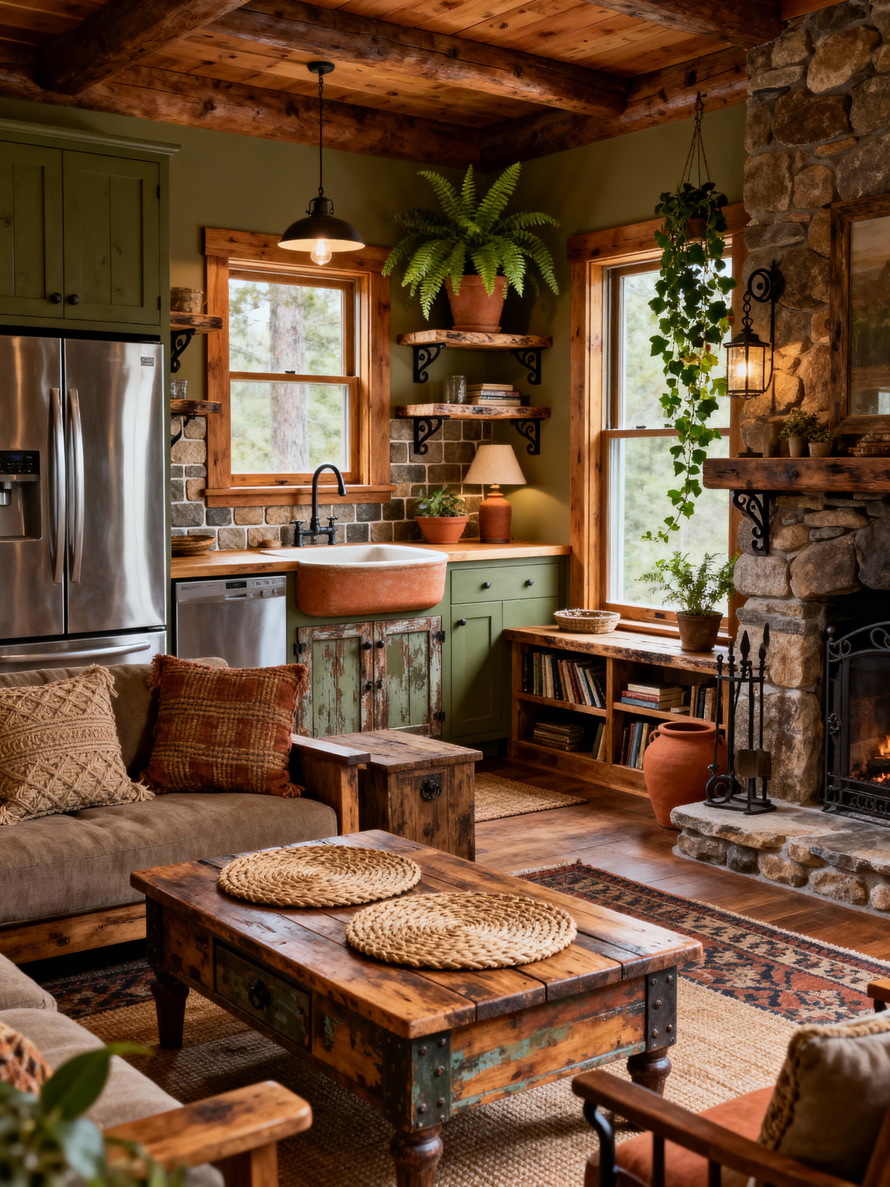 kitchen living combo with rustic style with plant and refrigerator and occasional tables and sink and bookshelves and furniture and worktops and coffee tables. . with stone accents and earthy tones and warmth and woven textures and distressed finishes and natural wood and cozy cabin and iron fixtures