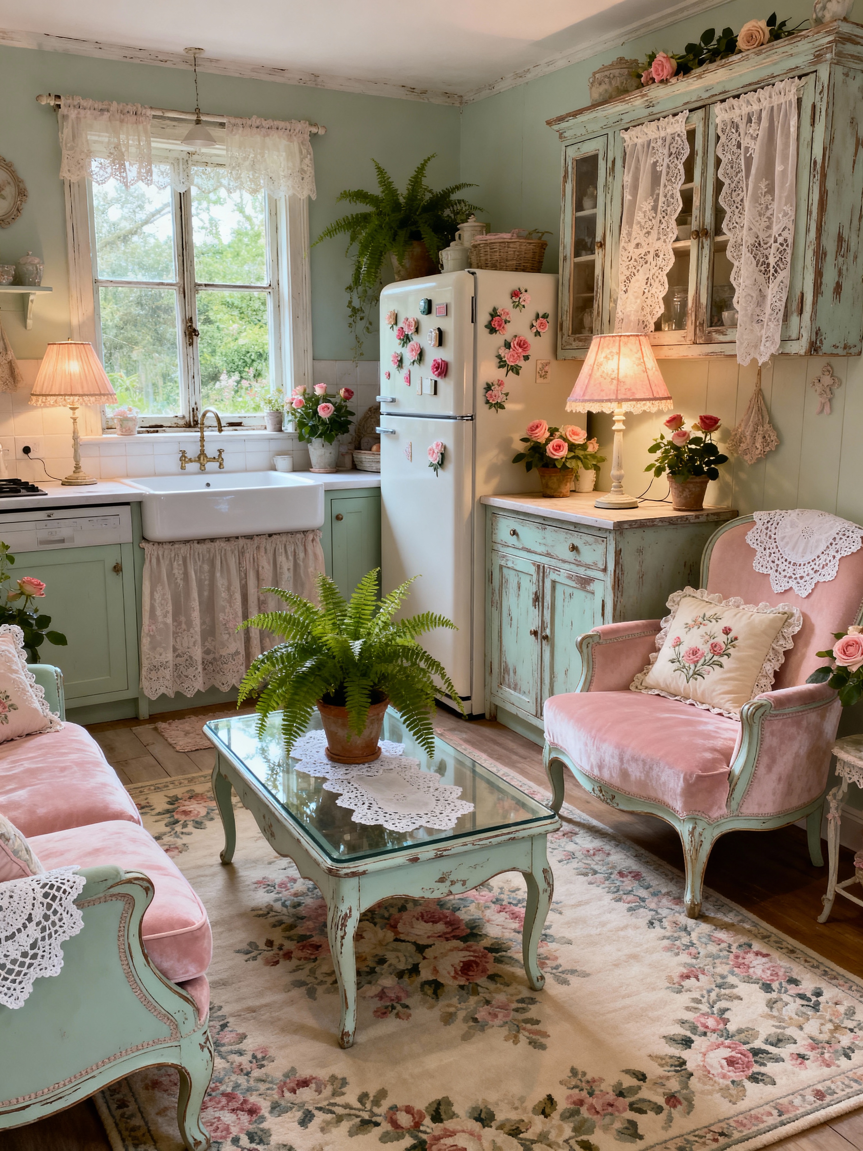 kitchen living combo with shabby chic style with sink and plant and electric lamps and refrigerator and plant and coffee tables and kitchen cabinets and rug. . with feminine touches and floral patterns and antique lace and delicate details and romantic style and distressed furniture and vintage charm and soft textures
