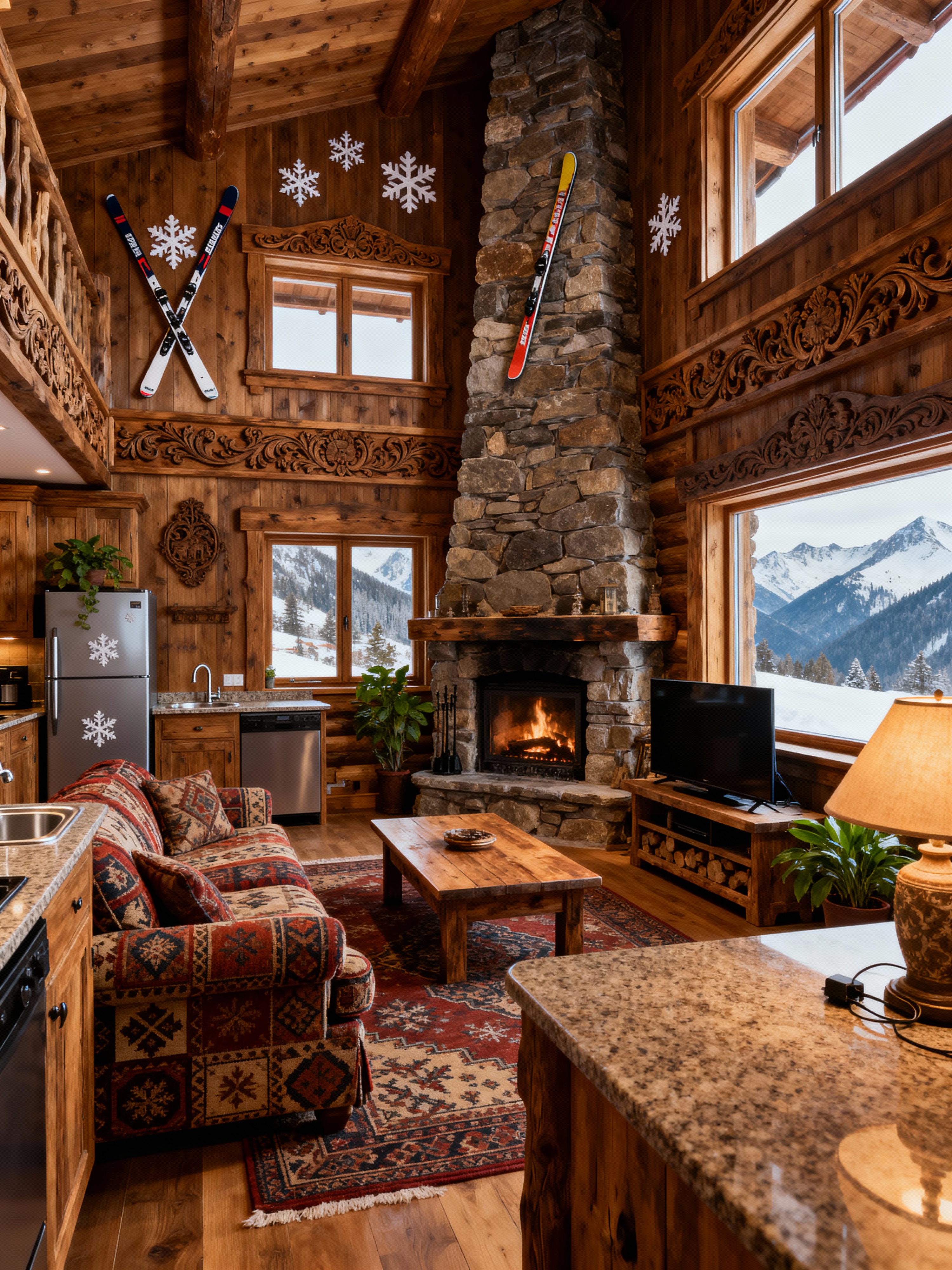 kitchen living combo with ski chalet style with coffee tables and furniture and televisions and plant and worktops and electric lamps and refrigerator and sink. . with rustic and mountain-inspired and richly patterned fabrics and window with mountain views and stone fireplace and ski-themed decor and wooden walls and decorative carving and mouldings