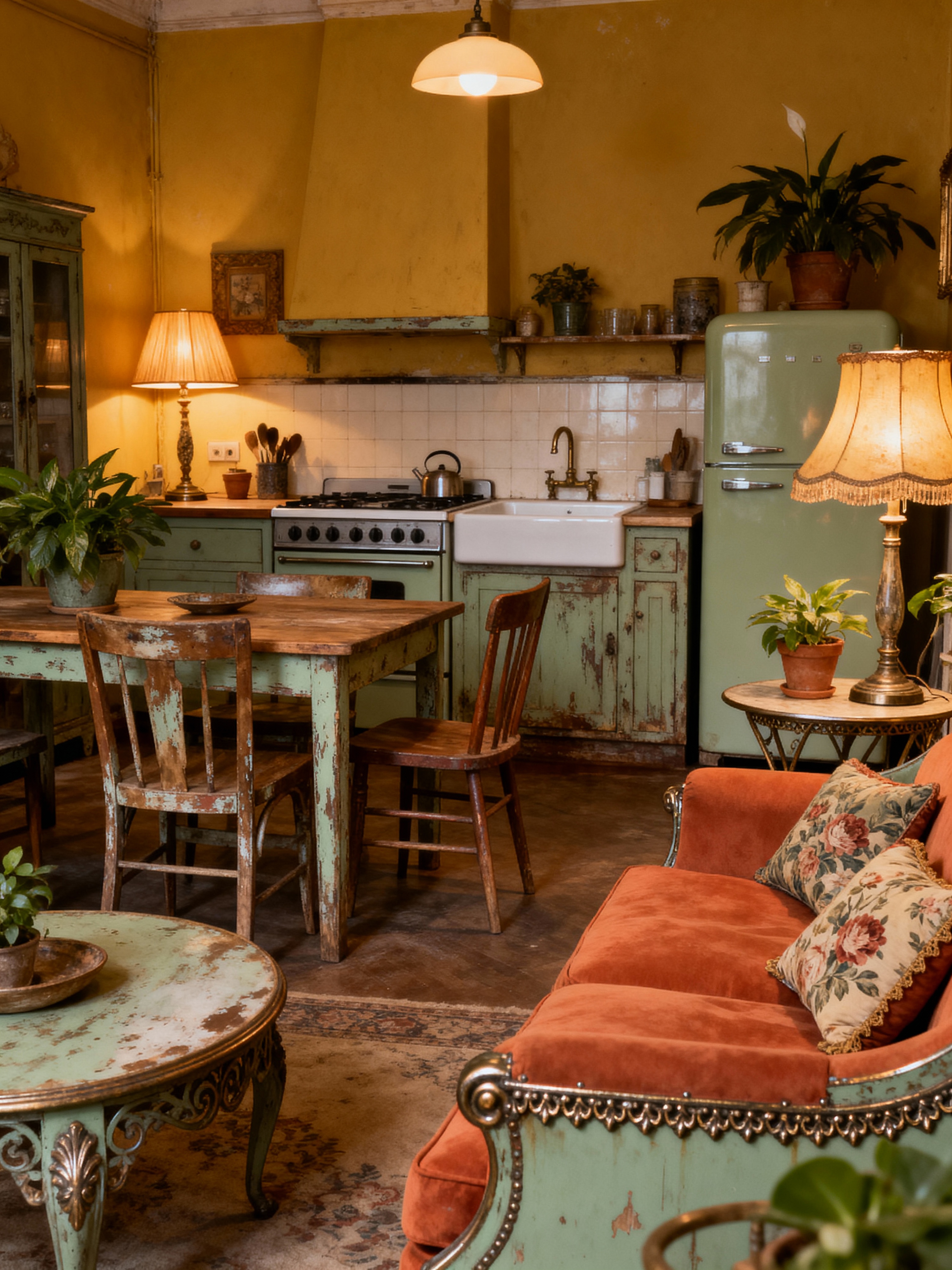kitchen living combo with vintage style with furniture and stove and electric lamps and chairs and plant and occasional tables and sink and refrigerator. . with antique decor and nostalgic feel and upcycled furniture and retro style and shabby chic and mid-century and eclectic and ornate details