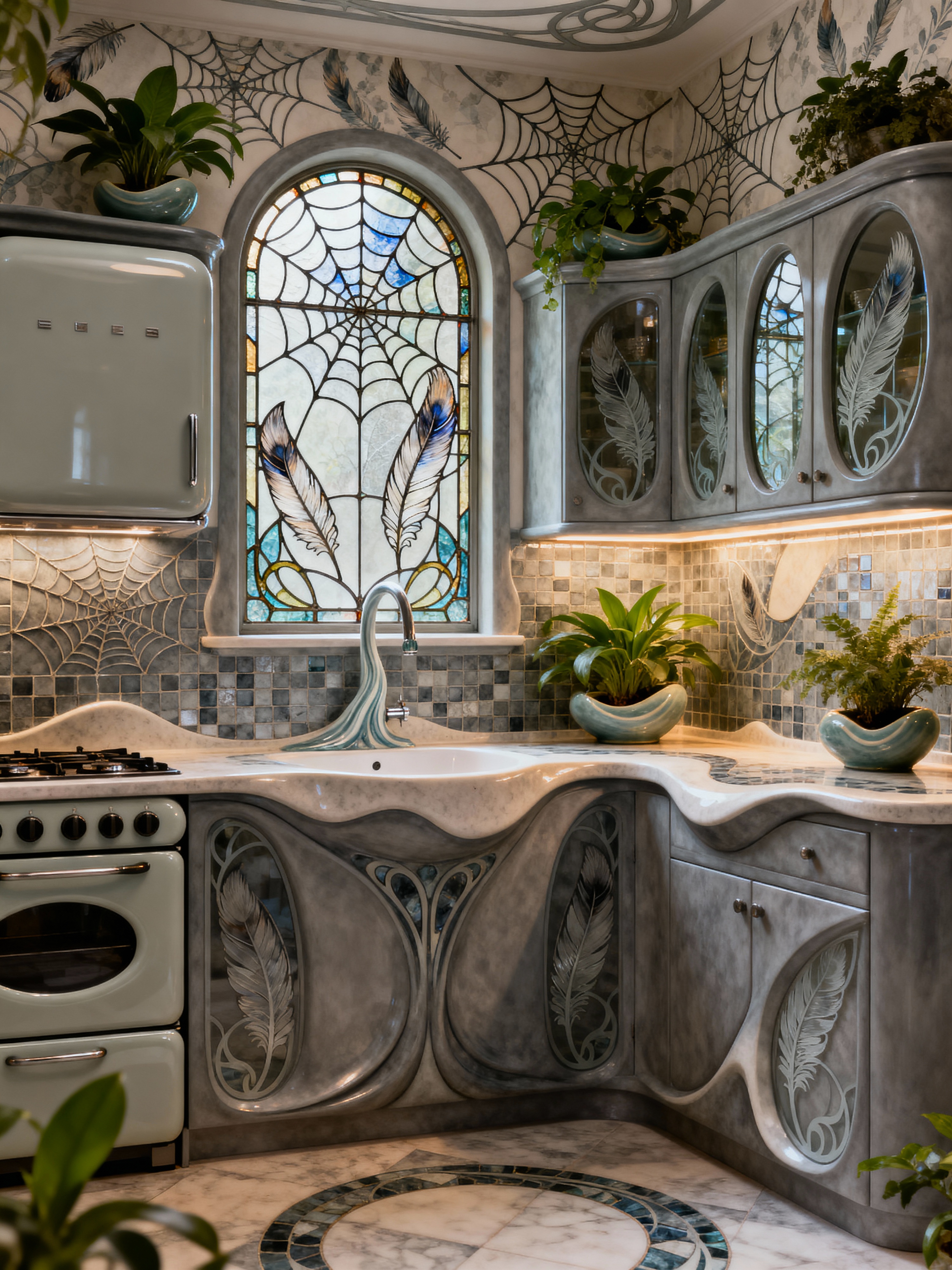 kitchen with art nouveau style with plant and kitchen cabinets and refrigerator and sink and worktops and stove and plant. . with soft, rounded lines and mosaics and wallpaper pattners of spider webs and stained glass and wallpaper patterns of feathers and curved glass and ashy colors and stained glass