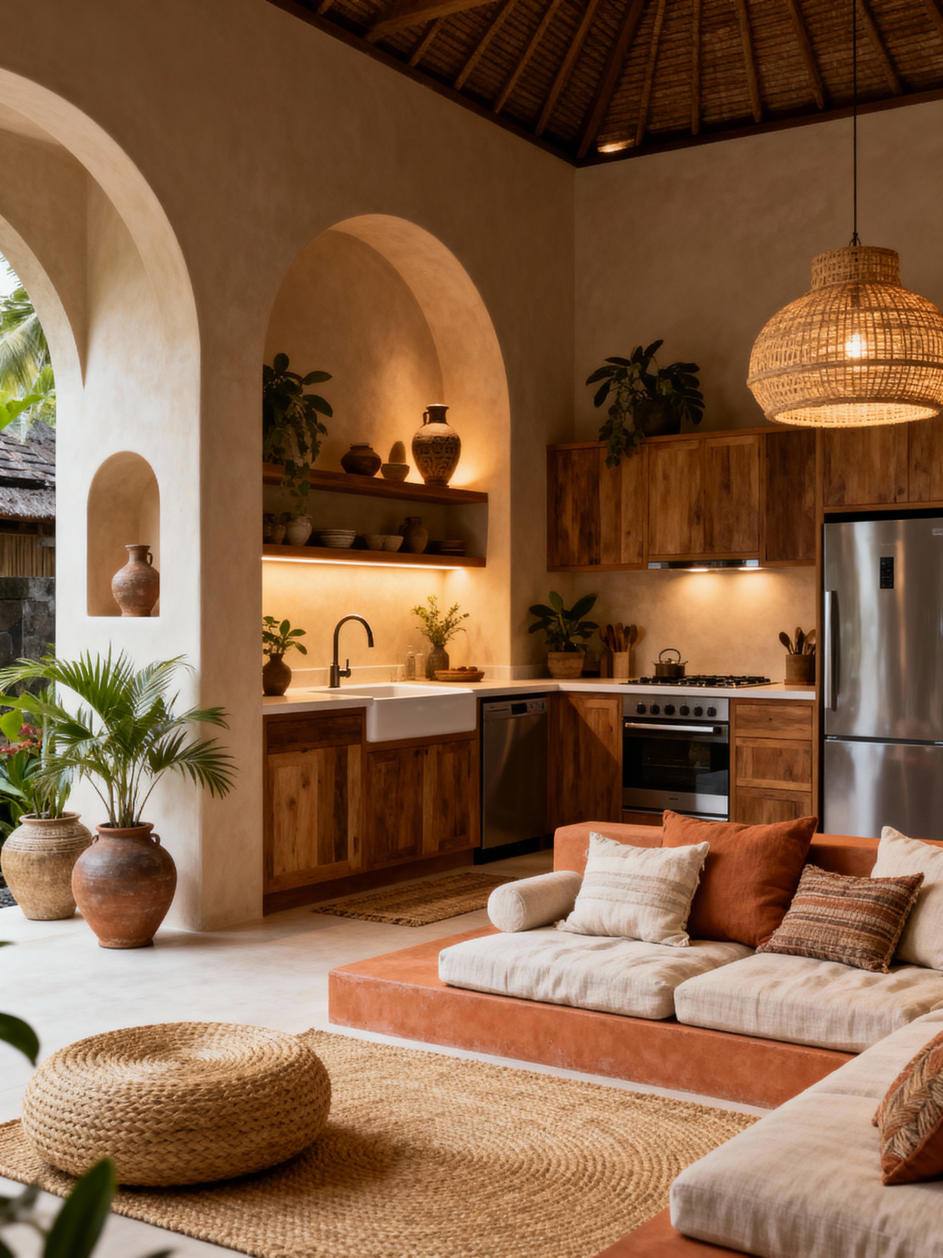 kitchen with bali style with sink and worktops and kitchen cabinets and refrigerator and plant and stove and sink. . with woven rugs (jute, seagrass) and linen or cotton fabrics and conversation pit with pillows and warm ambient lighting and low modular sofas and woven pendant lamps and handcrafted pottery and vases and arched walls and niches