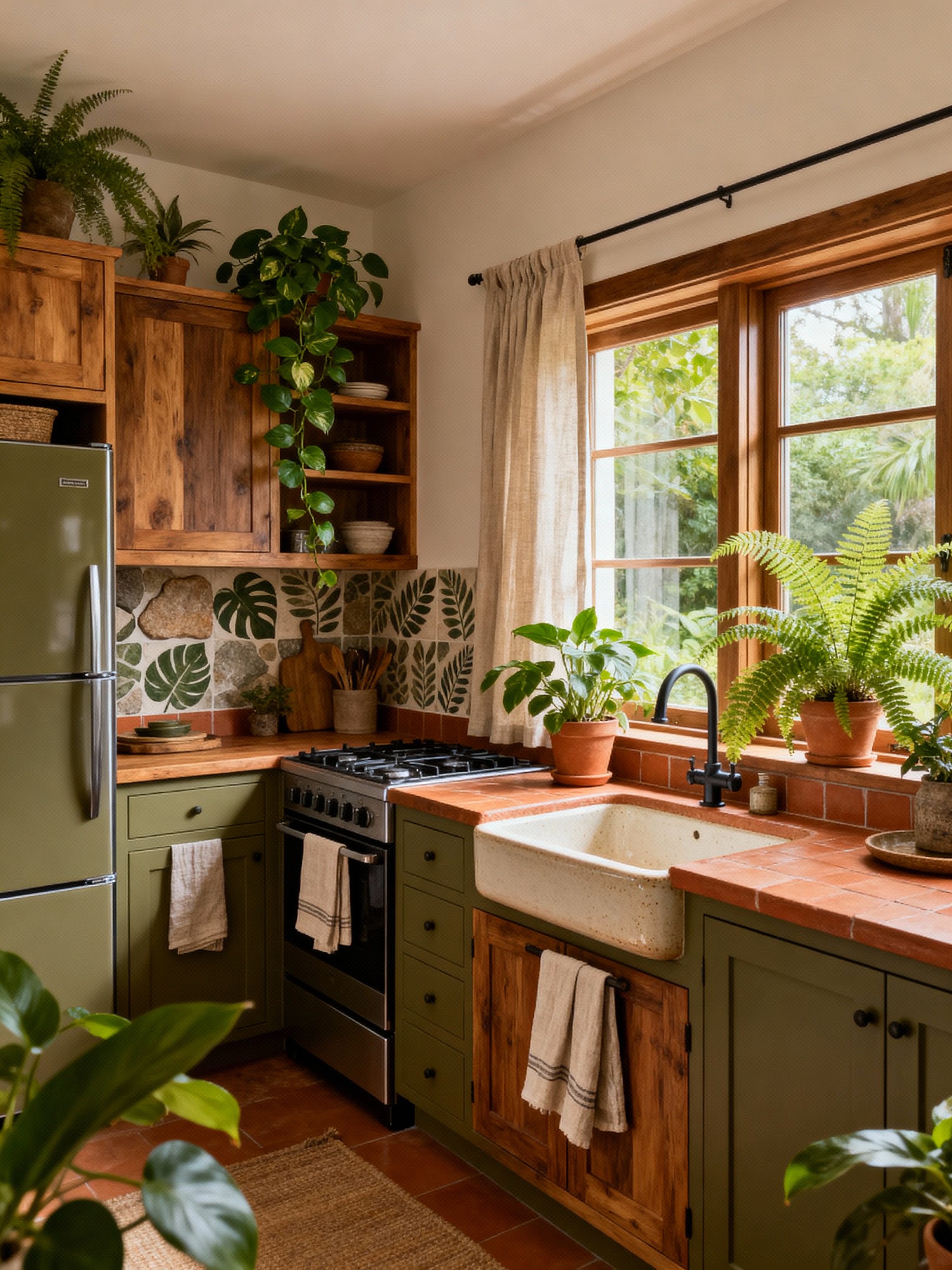 kitchen with biophilic style with refrigerator and stove and kitchen cabinets and plant and worktops and sink and refrigerator. . with earthy colors and natural patterns and features of nature and natural environment and fresh air and ceramic materials and wood materials and linen materials