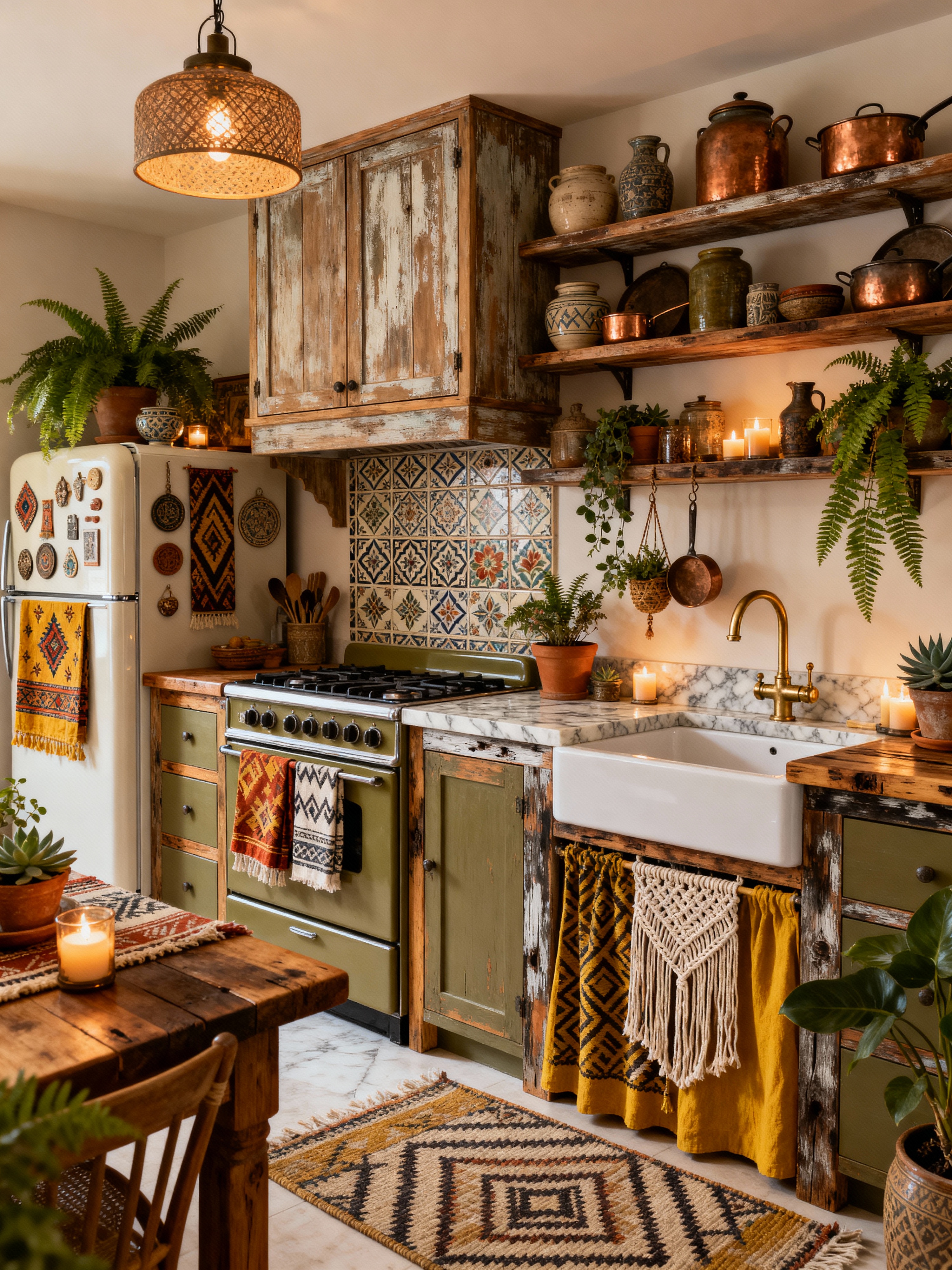 kitchen with boho-chic style with kitchen cabinets and worktops and stove and refrigerator and sink and plant and kitchen cabinets. . with eclectic mix and relaxed atmosphere and vintage finds and earthy colors and mixed patterns and layered textiles and global artifacts and free-spirited