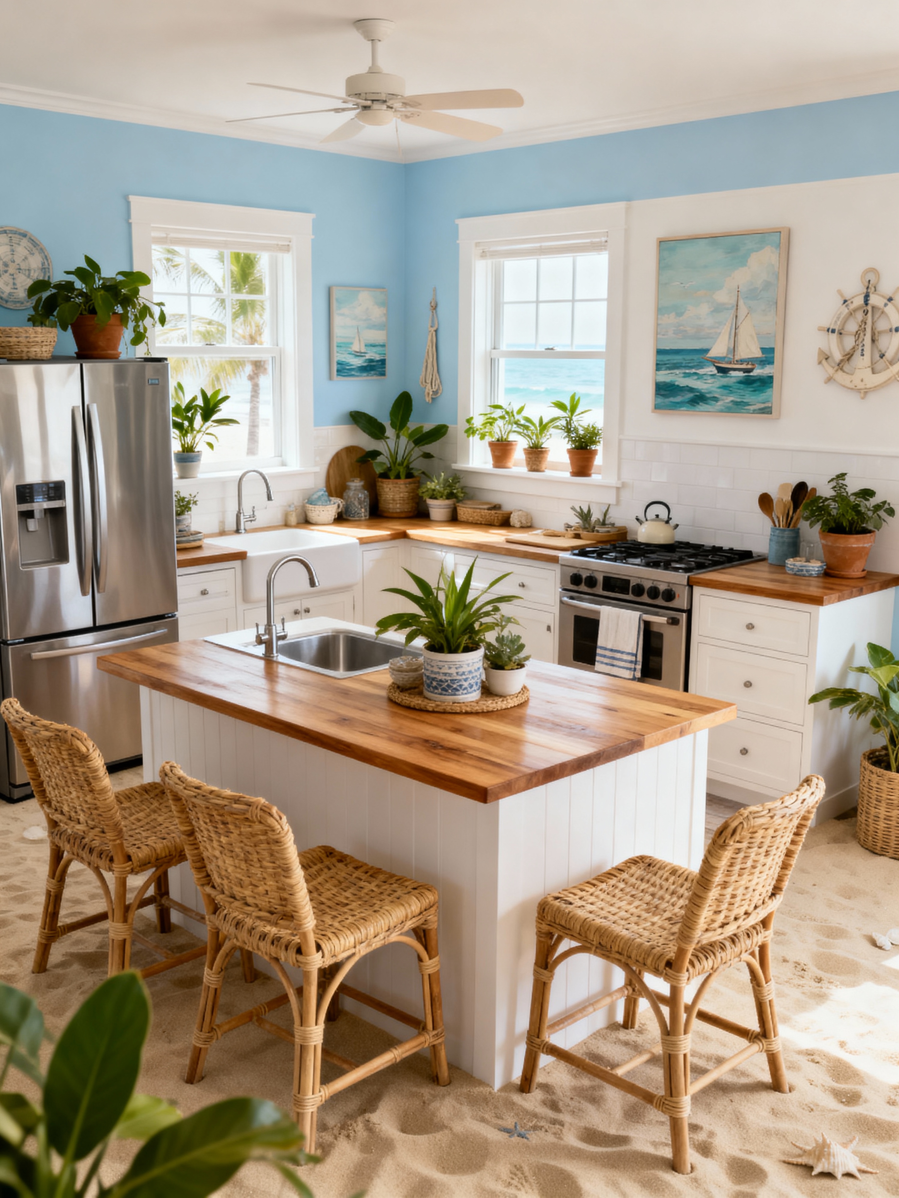 kitchen with coastal style with plant and refrigerator and sink and worktops and kitchen cabinets and stove and plant. . with ocean-inspired and seaside colors and wicker furniture and sand tones and nautical decor and airy feel and relaxed style and natural materials