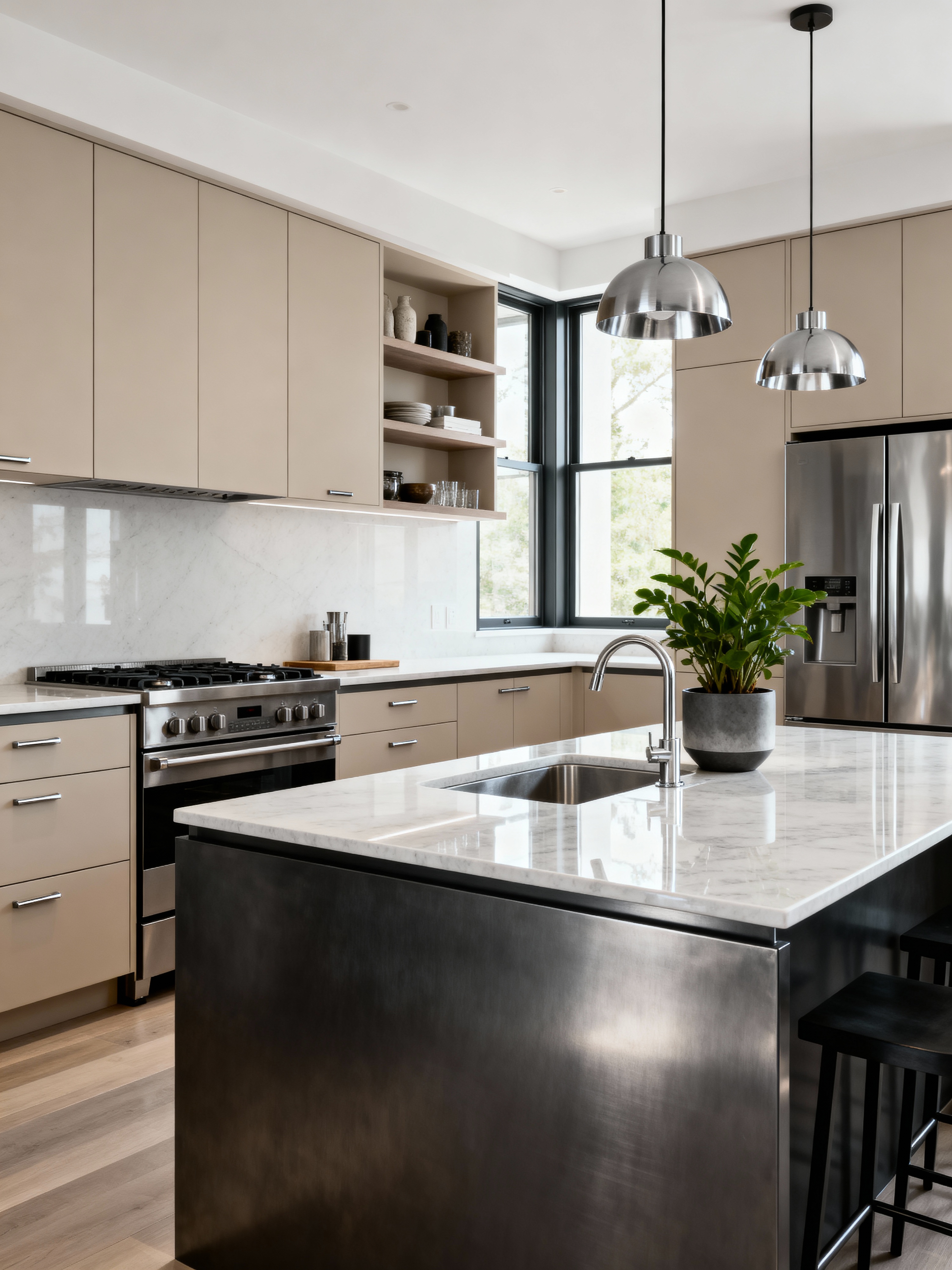 kitchen with contemporary style with worktops and kitchen cabinets and stove and refrigerator and plant and sink and worktops. . with sleek lines and metal accents and neutral palette and open spaces and high contrast and functional design and elegant simplicity and clean look