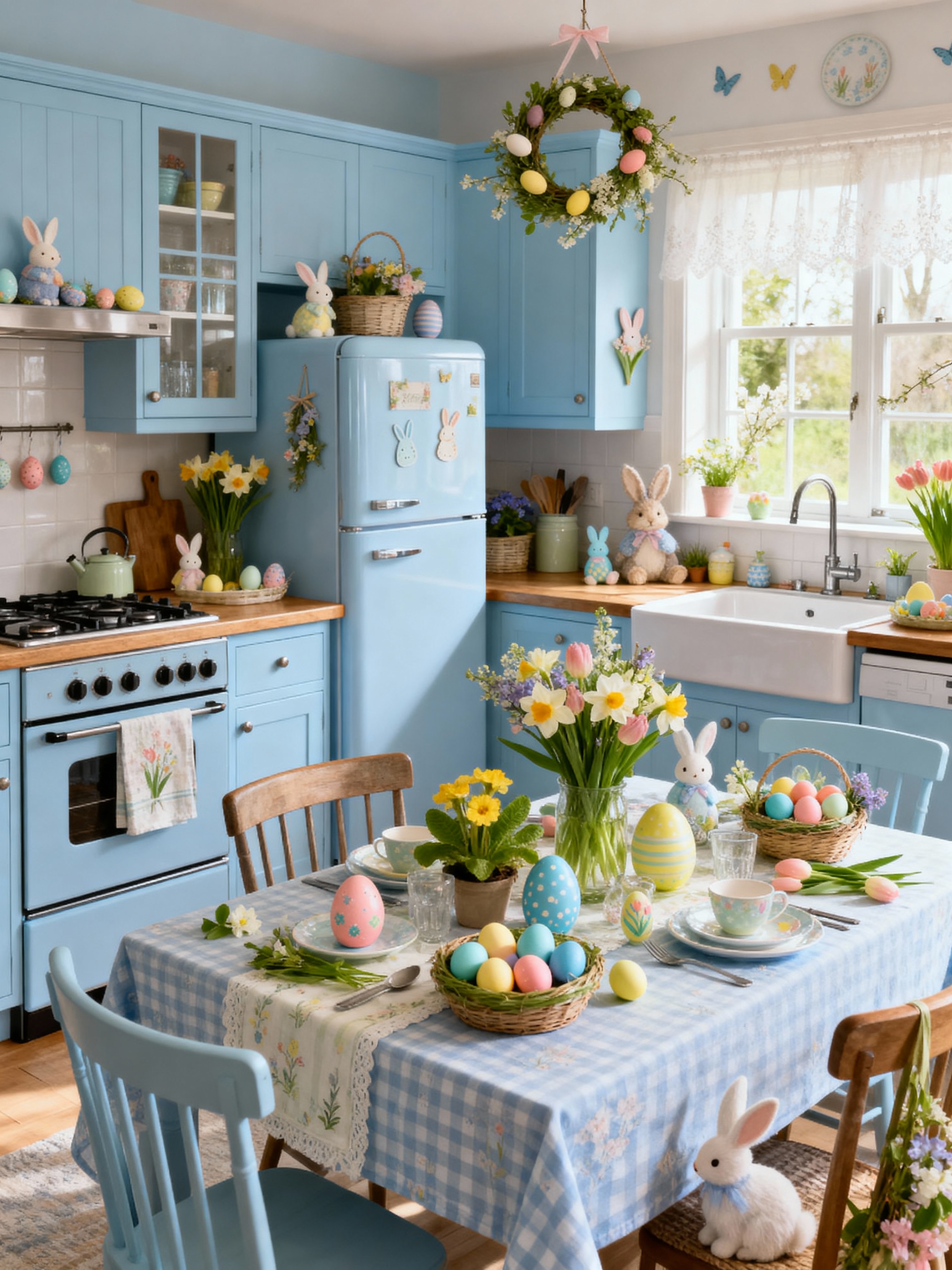 kitchen with easter style with stove and worktops and refrigerator and plant and sink and kitchen cabinets and stove. . with easter decorations and flowers on table and colorful easter eggs and spring decorations and light blue colors and easter decorations
