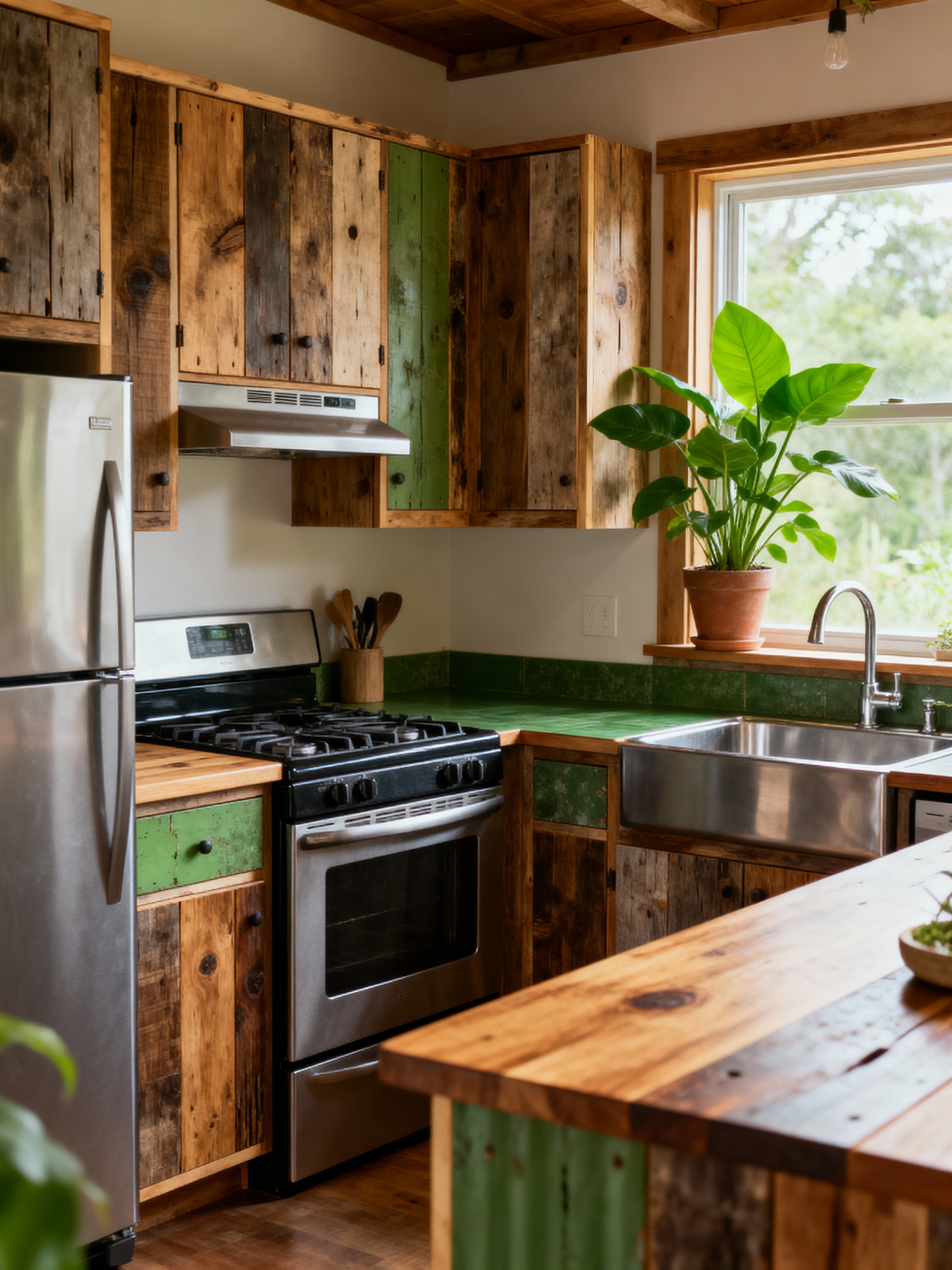 kitchen with eco-friendly style with worktops and sink and stove and kitchen cabinets and plant and refrigerator and worktops. . with environmentally conscious and reclaimed wood and non-toxic finishes and green living and renewable resources and sustainable materials and energy efficient and recycled elements