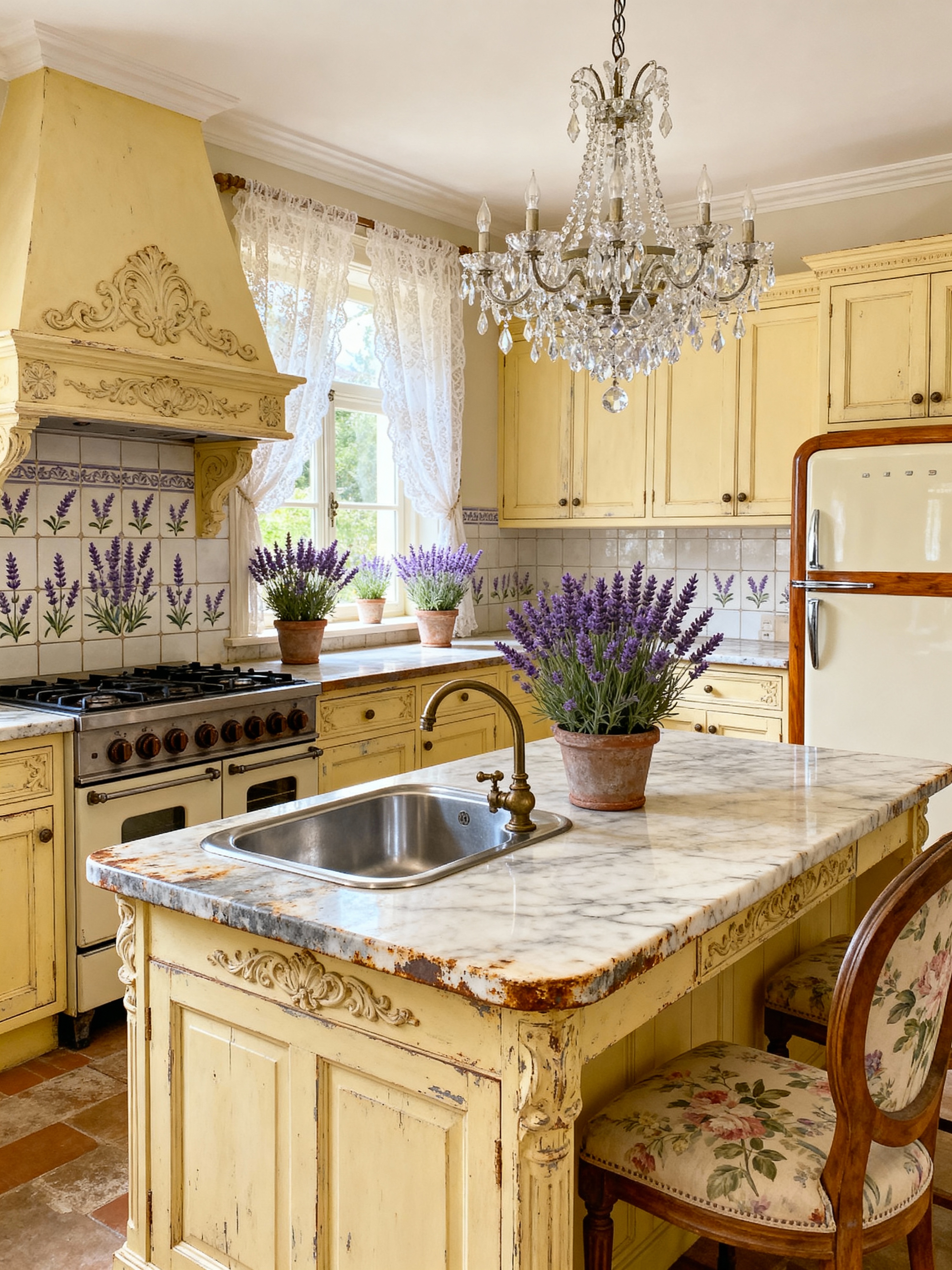 kitchen with french country style with worktops and plant and sink and refrigerator and stove and kitchen cabinets and worktops. . with elegant rustic and chandeliers and distressed wood and lavender accents and warm tones and ornate details and vintage furniture and country elegance