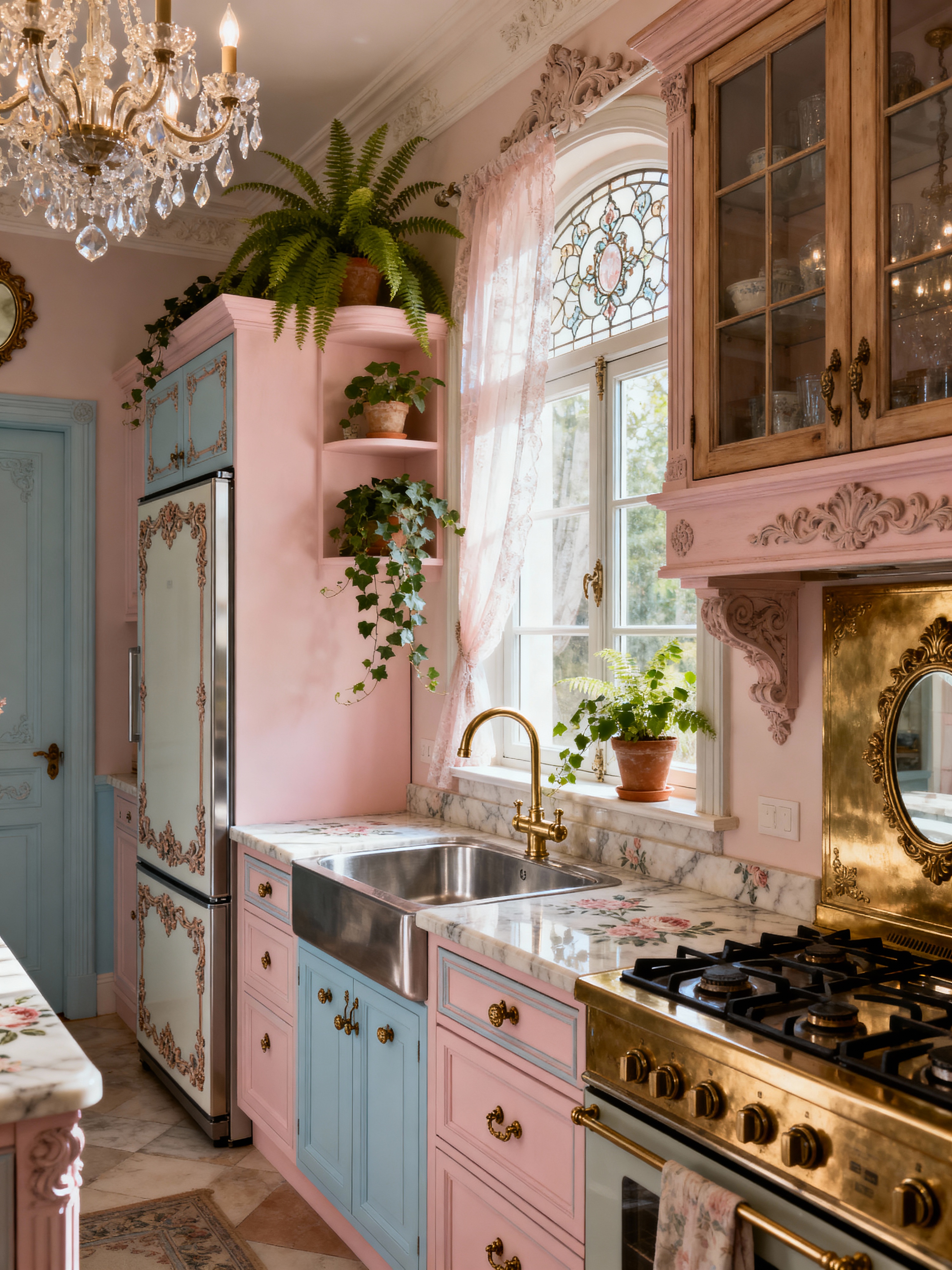 kitchen with french style with plant and sink and refrigerator and kitchen cabinets and worktops and stove and plant. . with ornate furniture and classic beauty and sophisticated grace and soft pastels and refined luxury and crystal accents and romantic style and antique pieces