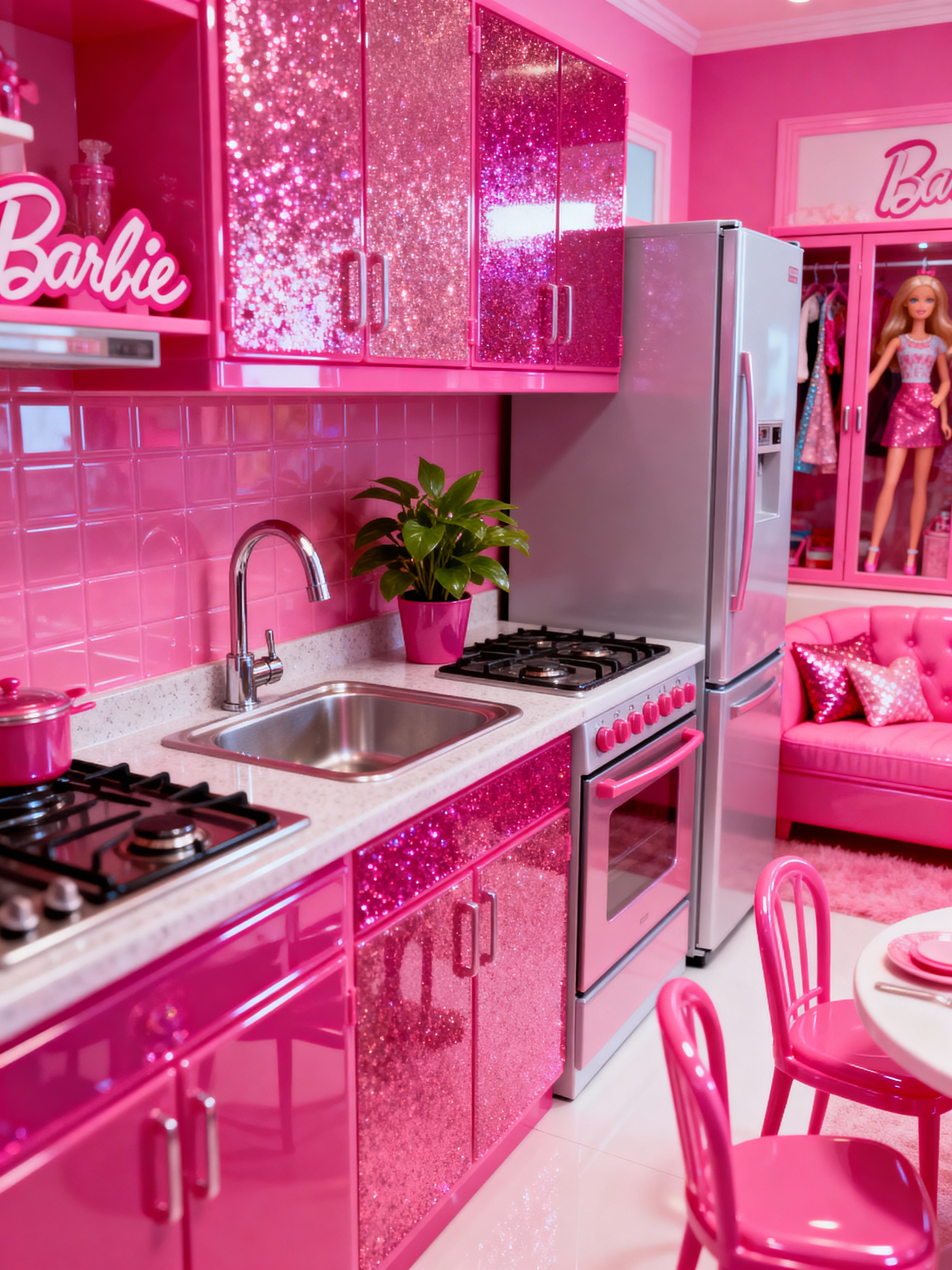 kitchen with hot pink style with sink and kitchen cabinets and plant and refrigerator and worktops and stove and sink. . with barbie style interior and hot pink barbie walls and barbie bold rosy hues like fuchsia and magenta and barbie closet and barbie sofa and barbie plastic interior and barbie chairs and barbie glitter and sparkle