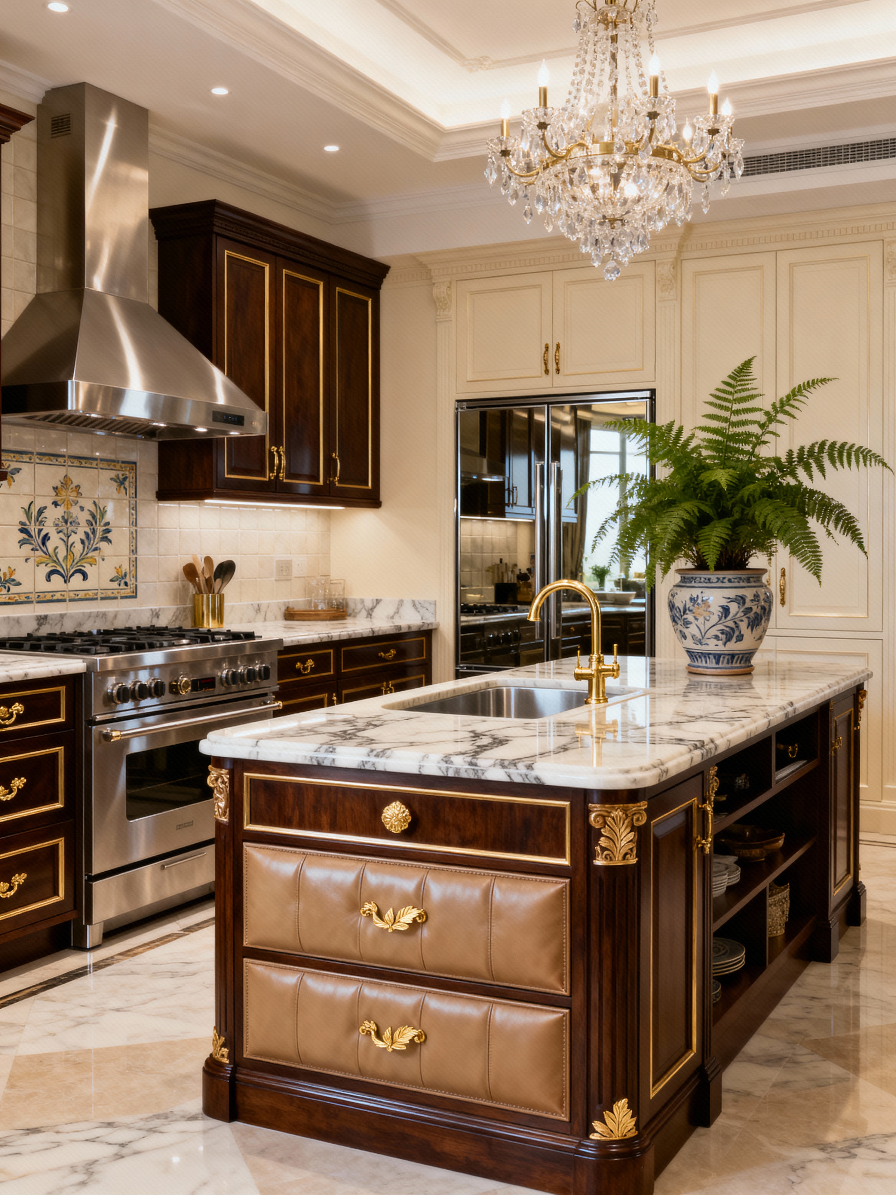 kitchen with luxury style with worktops and kitchen cabinets and refrigerator and sink and plant and stove and worktops. . with high-end materials and custom pieces and opulent details and designer furniture and elegant lighting and exclusive design and sophisticated style and premium finishes