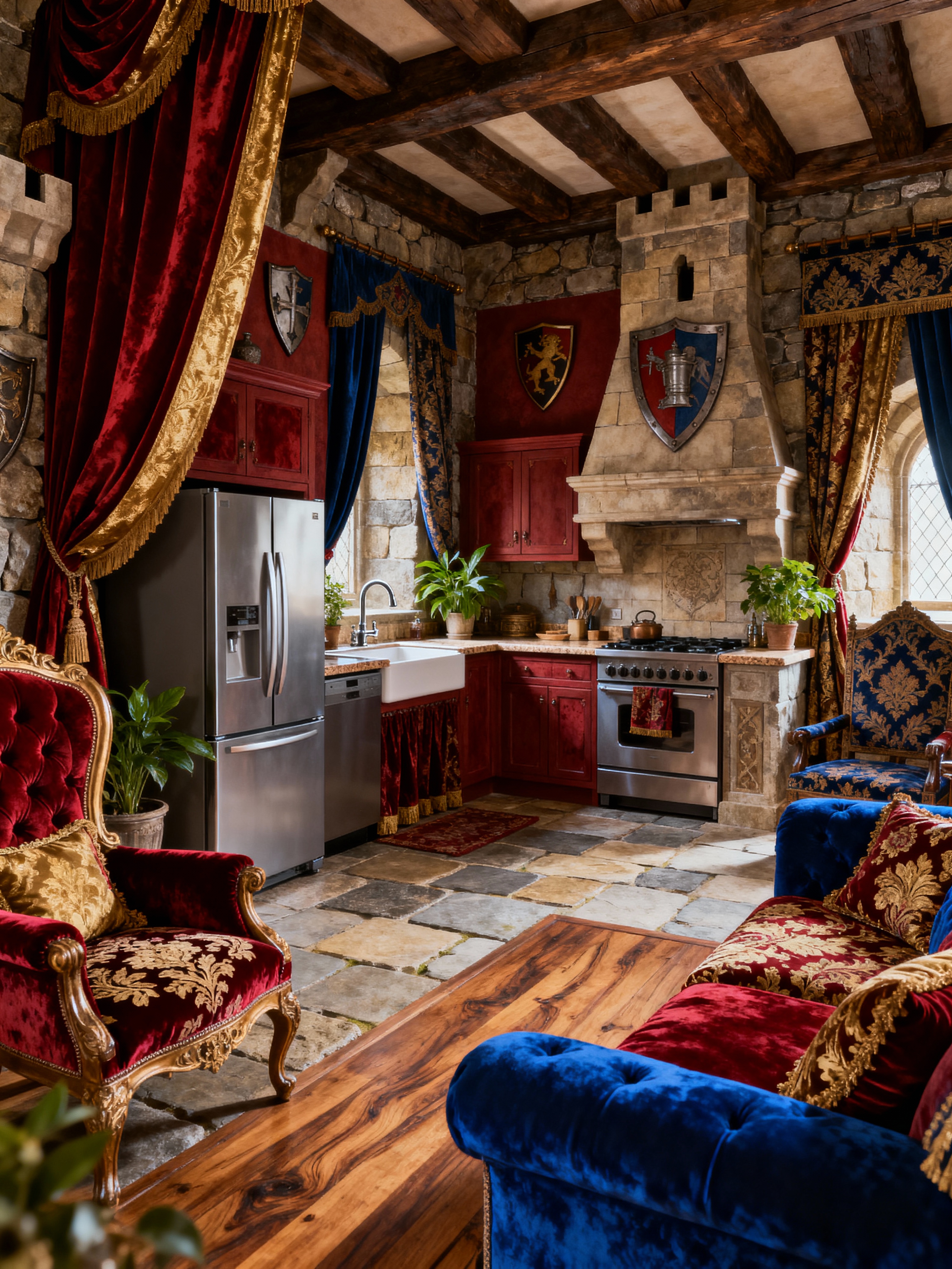 kitchen with medieval style with refrigerator and sink and kitchen cabinets and worktops and stove and plant and refrigerator. . with timber beams and velvet, chenille, damask, and brocade draperies and fabrics and stone walls and stone or wooden floor and medieval shields on the wall and castle interior and upholstery on chairs and sofas and deep colors like red, gold, or blue