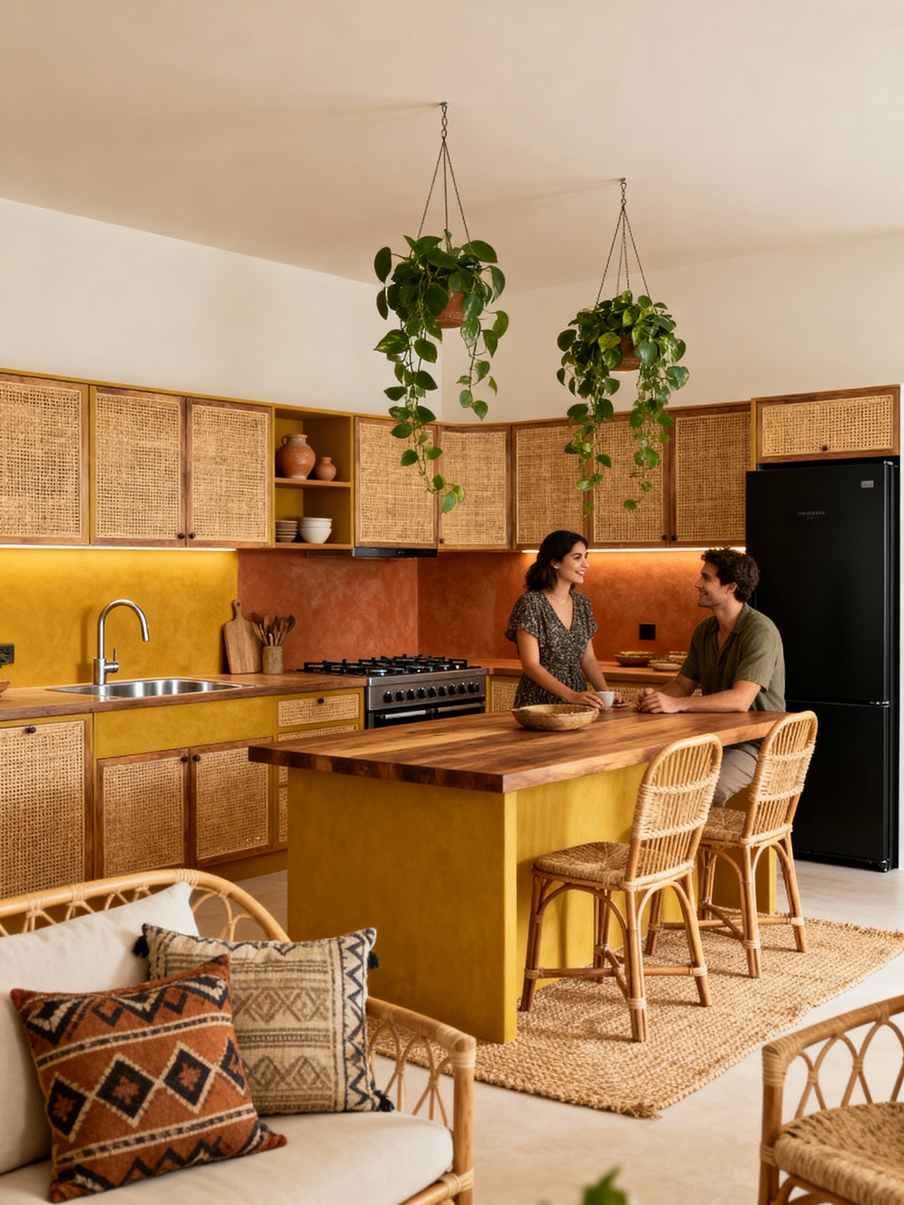 kitchen with modern boho style with kitchen cabinets and plant and worktops and sink and refrigerator and stove and kitchen cabinets. . with woven textures and rattan furniture and natural materials and earthy tones and comfortable and jute rugs and hanging plants and minimalist