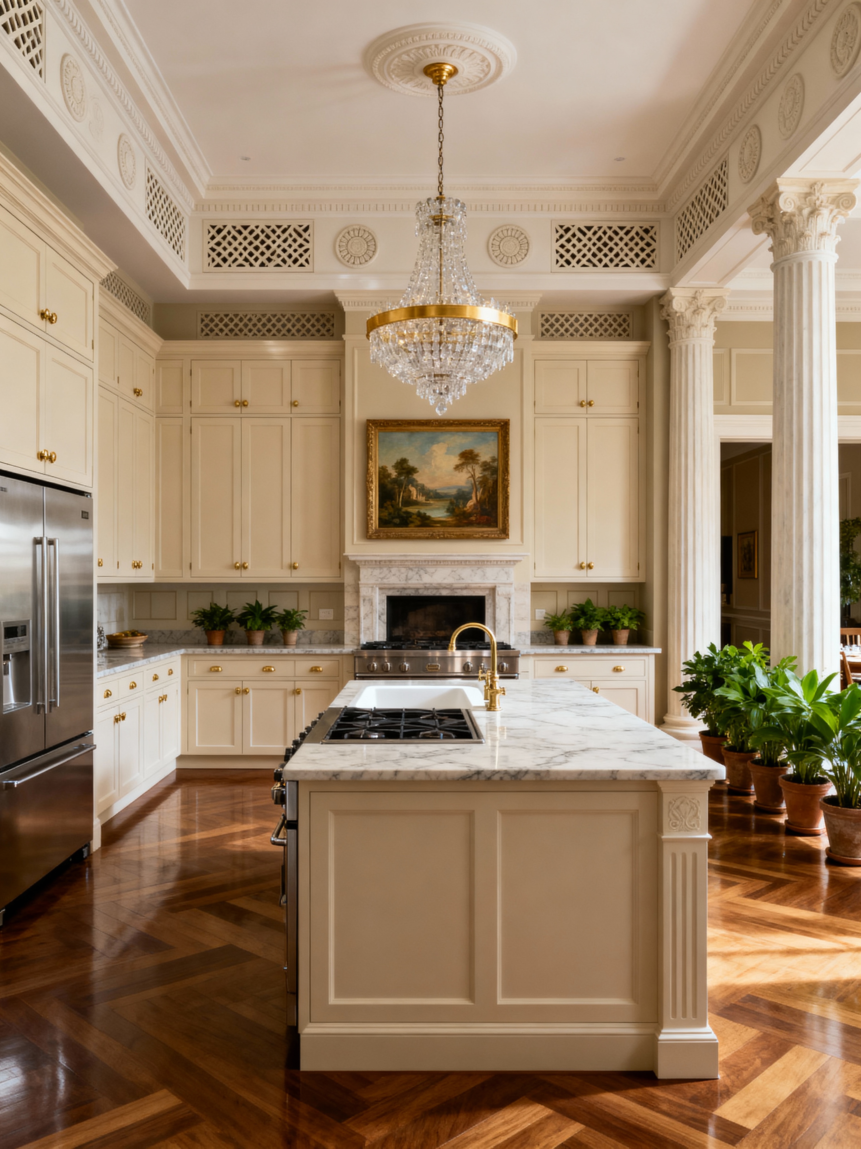 kitchen with neoclassic style with refrigerator and plant and kitchen cabinets and stove and worktops and sink and refrigerator. . with timeless artwork and symmetric layouts and geometric decorative elements and emphasized horizontal and vertical lines and timeless furniture and classical architectural details and greek columns and spacious rooms