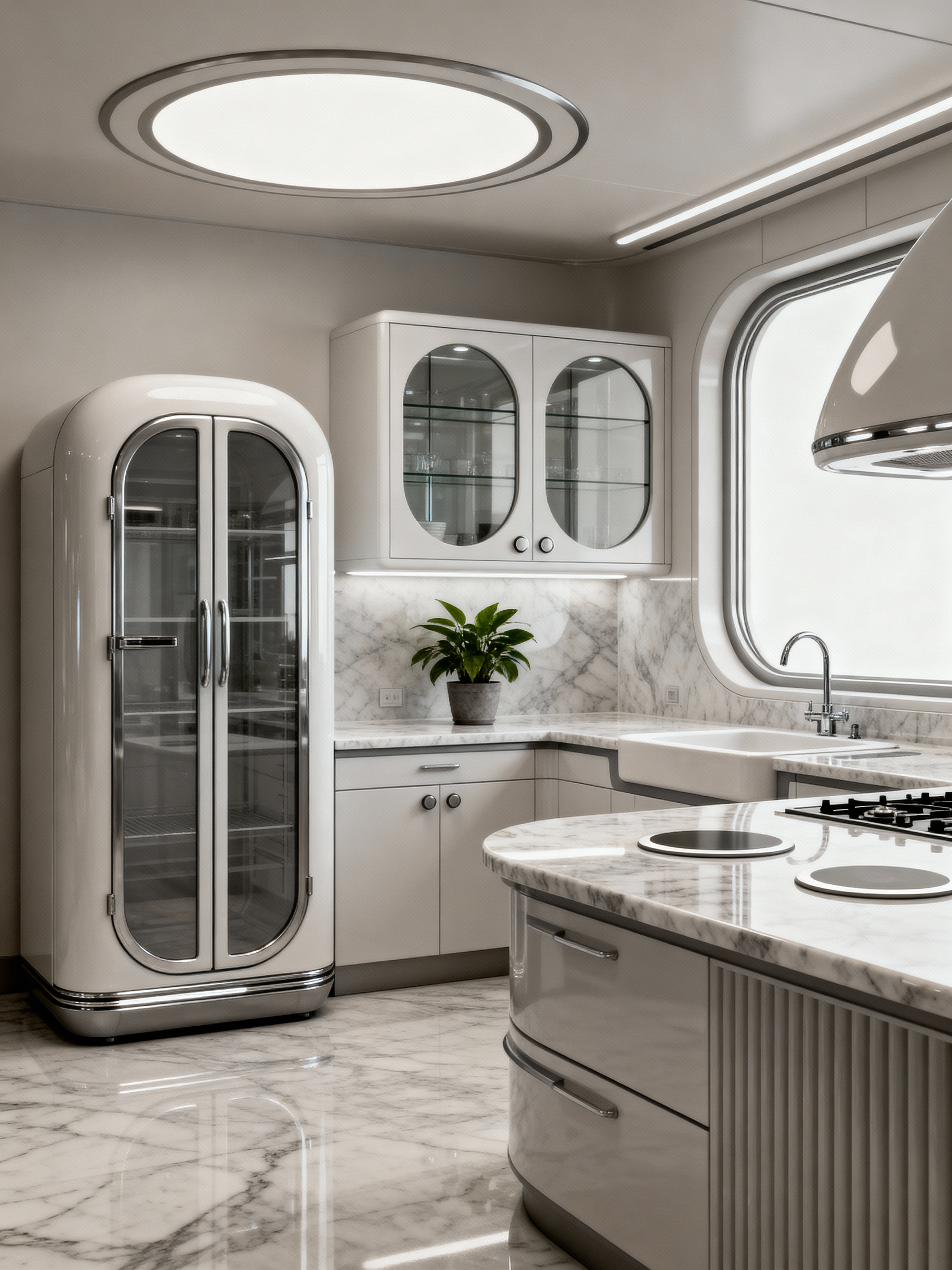 kitchen with retro futuristic style with refrigerator and worktops and plant and sink and stove and kitchen cabinets and refrigerator. . with vintage futurism and futurism minimalist interior and minimalist clean lines and glass panes and circular shapes and monochromatic palette and smooth polished marble and light colors