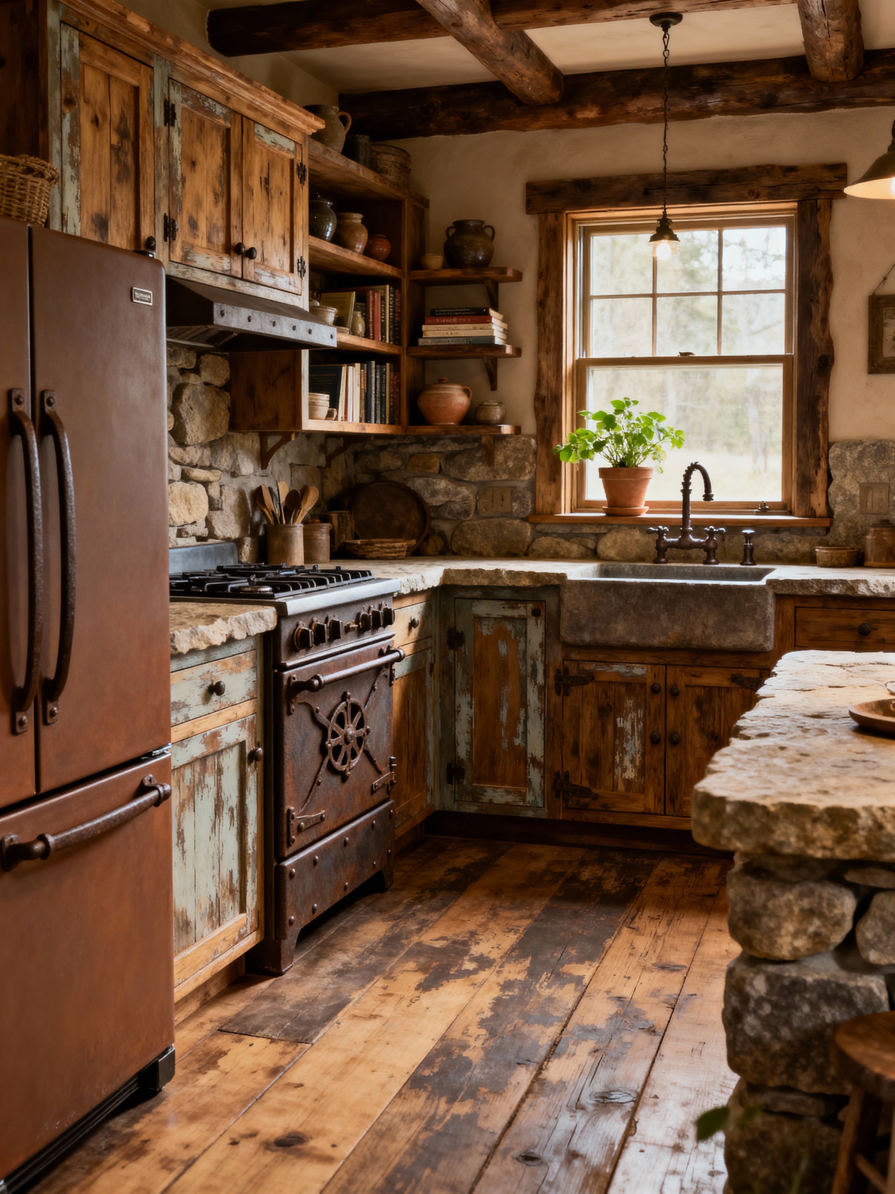 kitchen with rustic style with kitchen cabinets and refrigerator and worktops and stove and plant and sink and kitchen cabinets. . with stone accents and natural wood and country style and warmth and distressed finishes and earthy tones and iron fixtures and cozy cabin